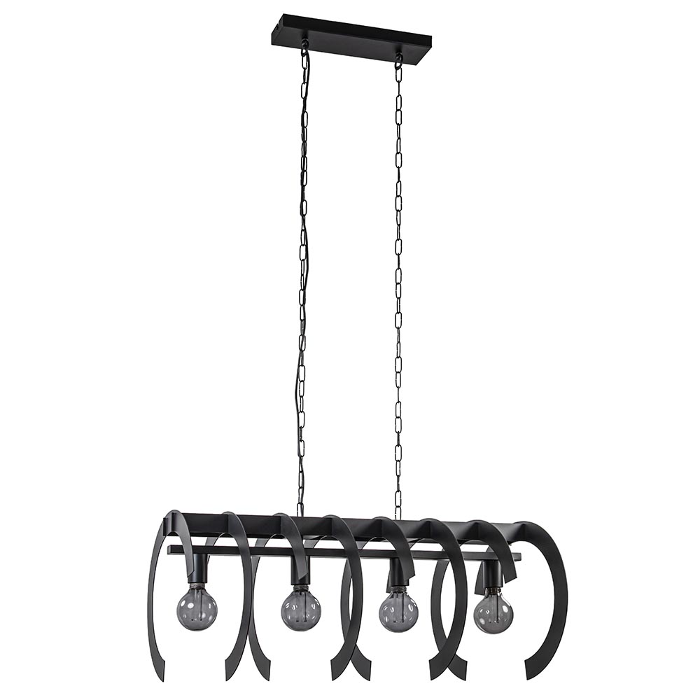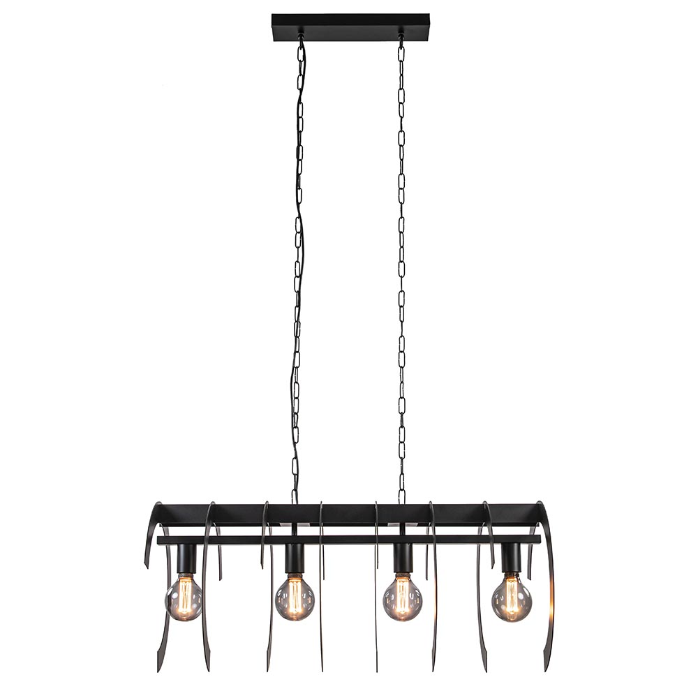 Industrieel meets design. Deze stoere hanglamp heeft een robuuste look en is volledig gemaakt van metaal. Het metaal is afgewerkt met een mat zwarte finish wat de lamp geschikt maakt voor diverse woonstijlen. Leuk aan het design van de lamp is dan de ringen verspringen in het armatuur. Deze zijn niet volledig gesloten waardoor er een speels effect ontstaat. De metalen balk waar de ringen op worden geplaatst is voorzien van vier E27 fittingen en hangt aan twee kettingen die naar wens zijn in te korten. De mat zwarte hanglamp wordt bevestigd met een balk van 40 cm lang.
