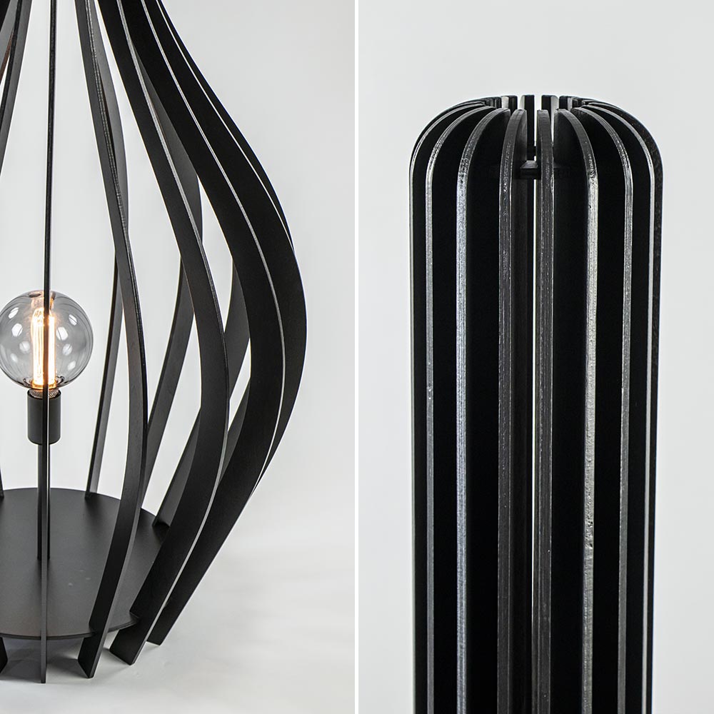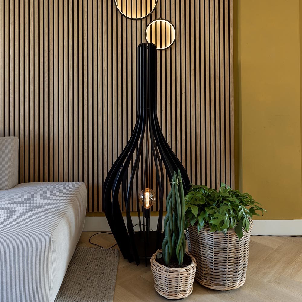 Soms is een lamp niet alleen verlichting maar ook een kunstobject op-zich. Zo ook deze kegel-vormige vloerlamp. De grote lamp is met zijn hoogte van 150 cm een ware eye-catcher in het interieur. De vloerlamp bestaat uit mat zwarte houten lamellen die op drie punten worden ondersteund. Onderin worden ze ondersteund door een ronde houten plaat waar ook de fitting op is bevestigd. Deze is van metaal en ook uitgevoerd in het mat zwart. Het hout heeft ook een onbehandelde look die op ieder stuk anders tekent. De mat zwarte houten vloerlamp is voorzien van een zwart snoer met een lengte van 300 cm en een schakelaar op 150 cm. Een prachtige vloerlamp voor wie een mooie hoek overheeft in het interieur. Het mat zwarte hout maakt de lamp prima geschikt voor diverse woonstijlen.