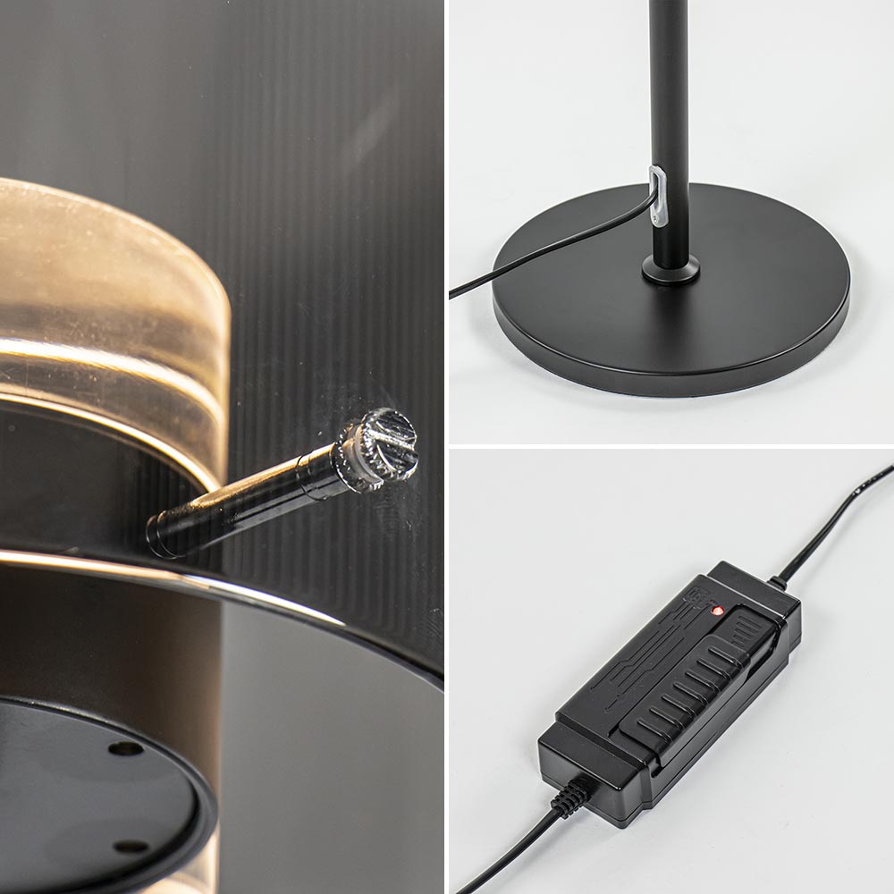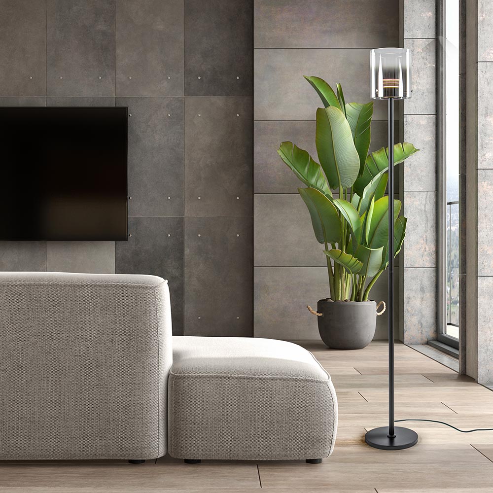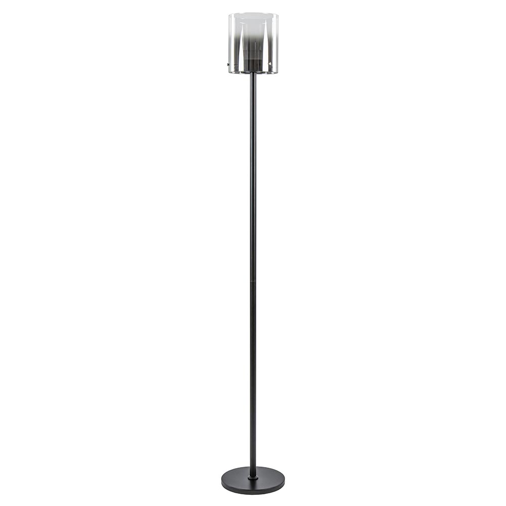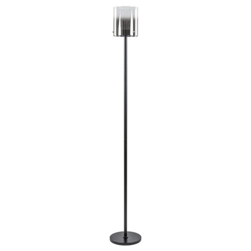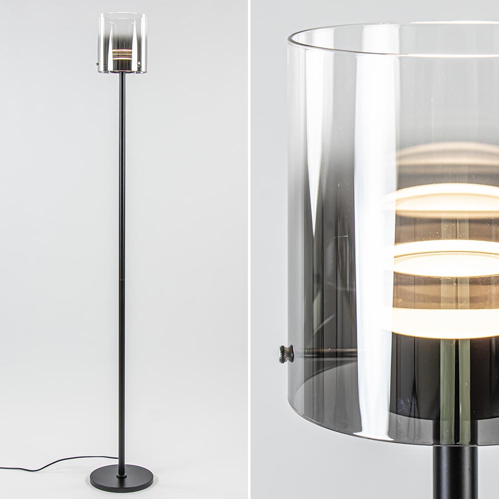 Een moderne vloerlamp met een luxe en chique uitstraling. De staande lamp is voorzien van LED en is daardoor energiezuinig. De LED vloerlamp bestaat uit een mat zwart armatuur en een glazen kap. De cilinder-vormige kap is voorzien van een verloop van titanium/smoke naar helder glas. Dit geeft de vloerlamp echt die luxe uitstraling die mooi is te combineren in een strak klassiek, modern of chique interieur. De LED staande lamp heeft een zwart snoer met een lengte van 230 cm, en een vloerdimmer op 70 cm van die ronde voet. Een mooie sfeervolle toevoeging aan het interieur.