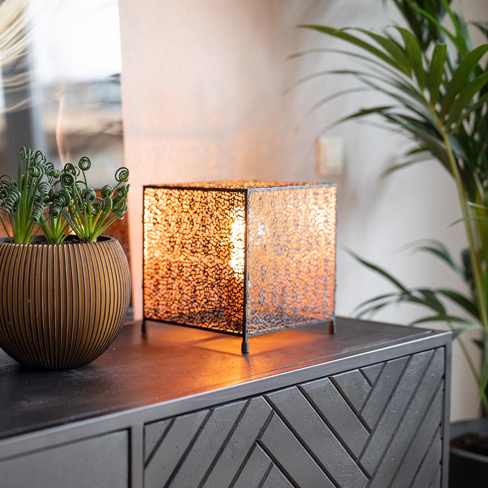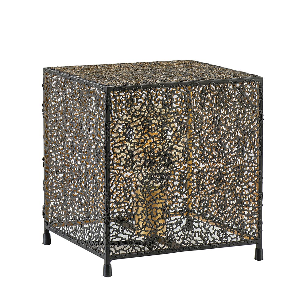 Stoer met een chique uitstraling. Deze moderne tafellamp doet een beetje denken aan koraal en is gemaakt uit kleine metaaldeeltjes die samen een vierkante kap vormen. Het metaal is afgewerkt met een mat zwarte finish aan de buitenzijde en een gouden finish aan de binnenzijde. Het goud zorgt voor een chique uitstraling en creëert een sfeervolle warme gloed. De tafellamp wordt geleverd inclusief zwart snoer van 200 CM. De schakelaar bevindt zich op 50 CM van het armatuur. Het tafellampje staat op vier sierlijke pootjes.