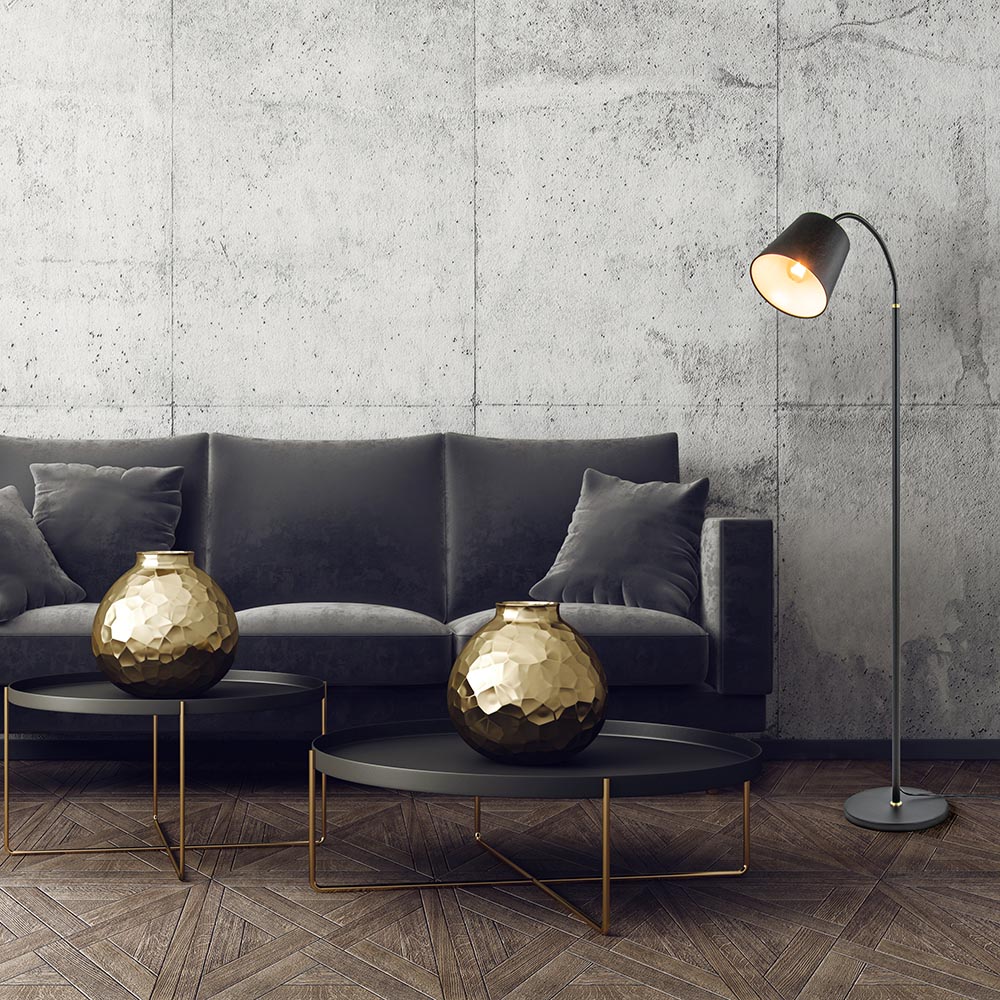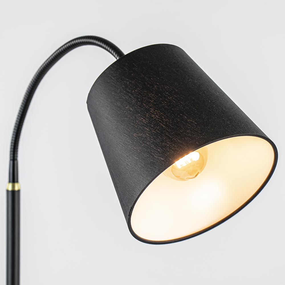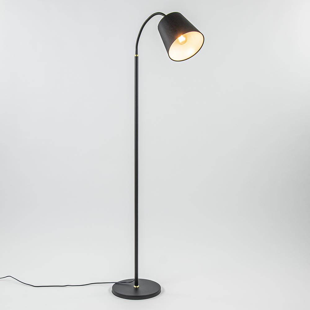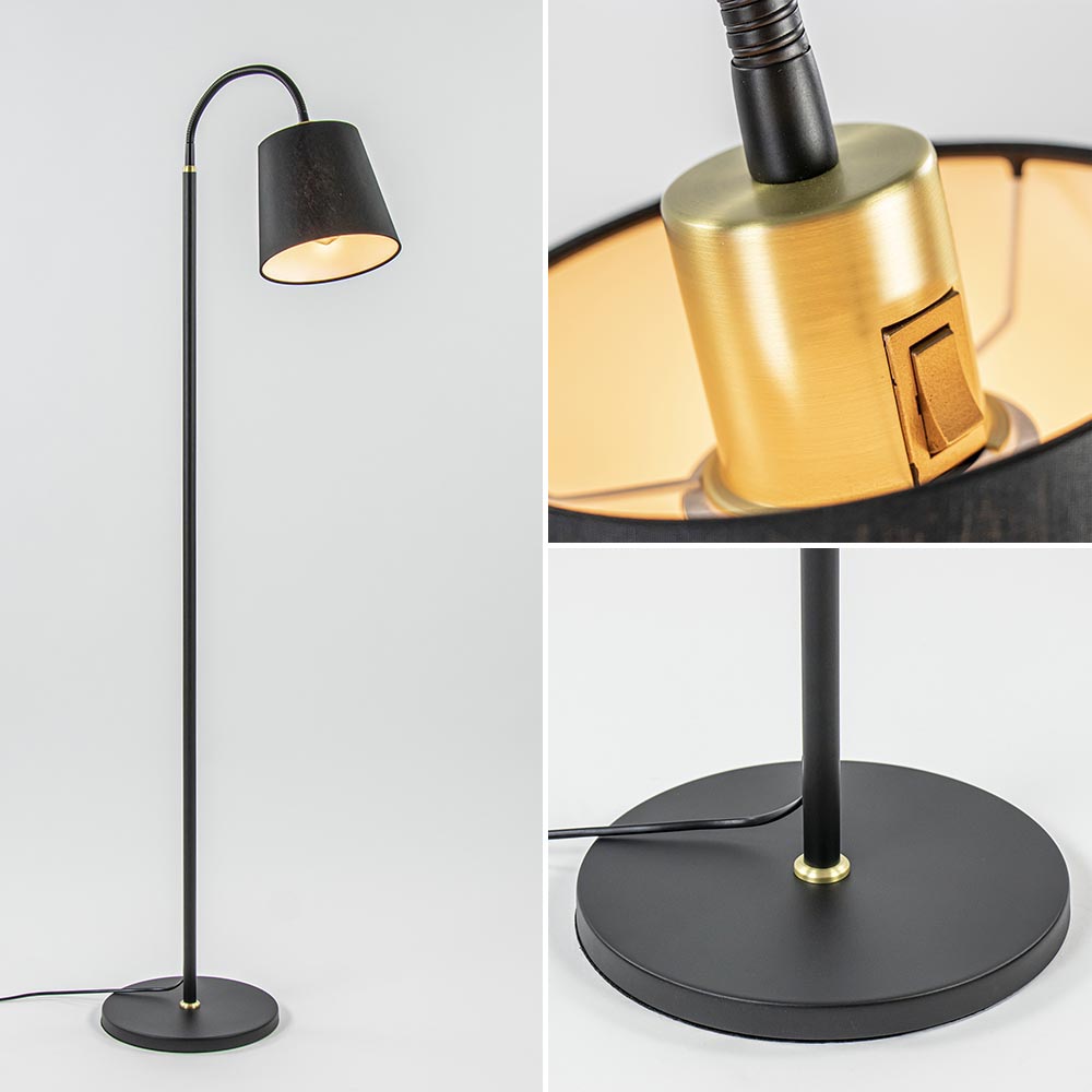 Een fijne sfeermaker voor in de woon- of slaapkamer. De vloerlamp is uitgevoerd in het mat zwart met gouden accenten wat zorgt voor een stijlvolle uitstraling. Het armatuur is voorzien van een flexibele arm welke u gemakkelijk kunt buigen of draaien. Zo plaatst u de lamp gemakkelijk in juiste vorm. De mat zwarte vloerlamp heeft een zwarte stoffen kap die wordt ondersteund door een gouden fitting. Het fijne aan deze fitting is dat deze is voorzien van een schakelaar. Zo hoeft u dus niet te zoeken naar een schakelaar in het snoer. Ideaal! De sfeervolle vloerlamp heeft een zwart snoer van 200 cm en wordt geleverd zonder lichtbron (E27).