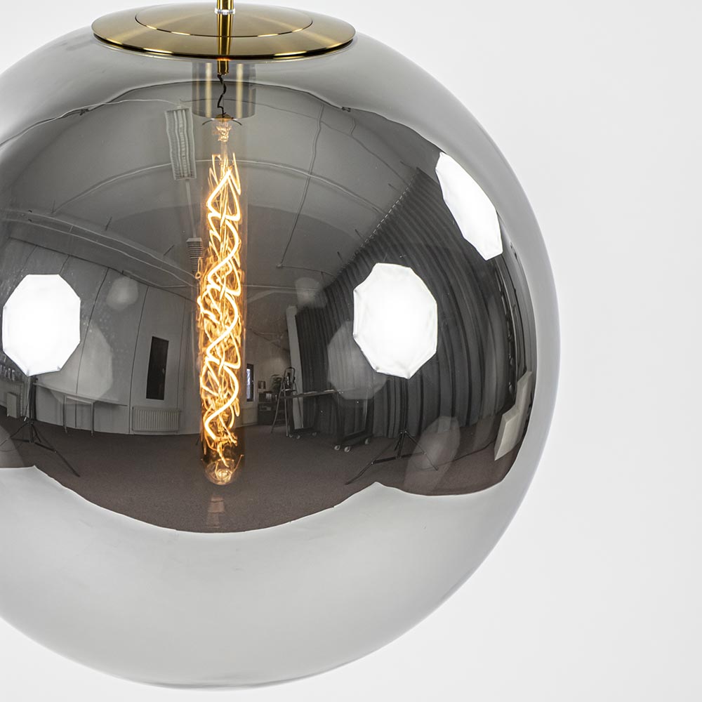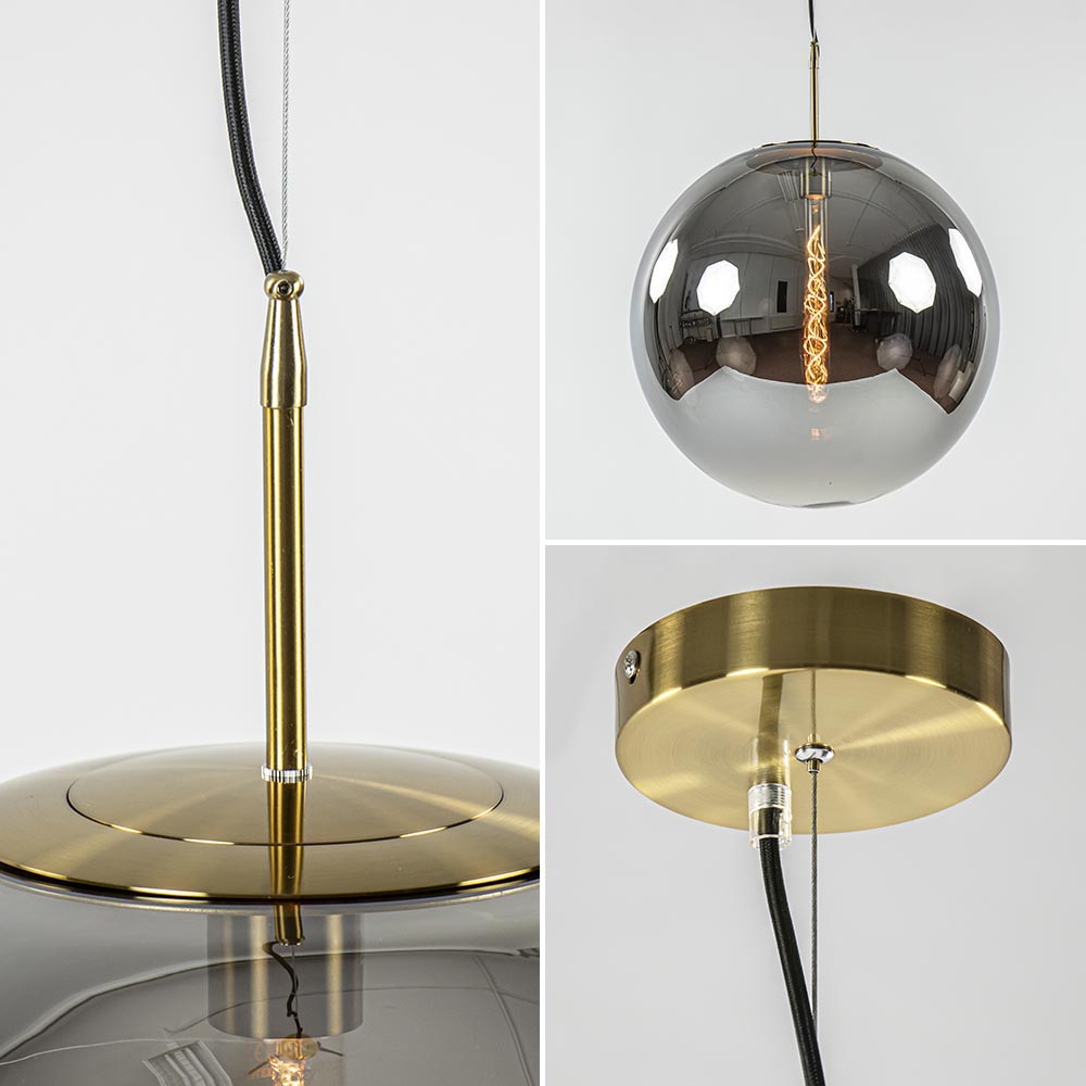 Deze extra grote bol van smoke-glas met een diepe titanium glans wordt, vanwege het gewicht, opgehangen met een staalkabel. De stroomtoevoer gaat ‘gewoon’ via een zwart stof omwonden snoer. Zowel de pendel als de plafondbevestiging hebben een brons afwerking. Dit geeft deze luxe hanglamp een klassieke en luxe uitstraling. Deze grote lamp is erg mooi boven een ronde eettafel, of twee of drie stuks boven een lange eettafel.