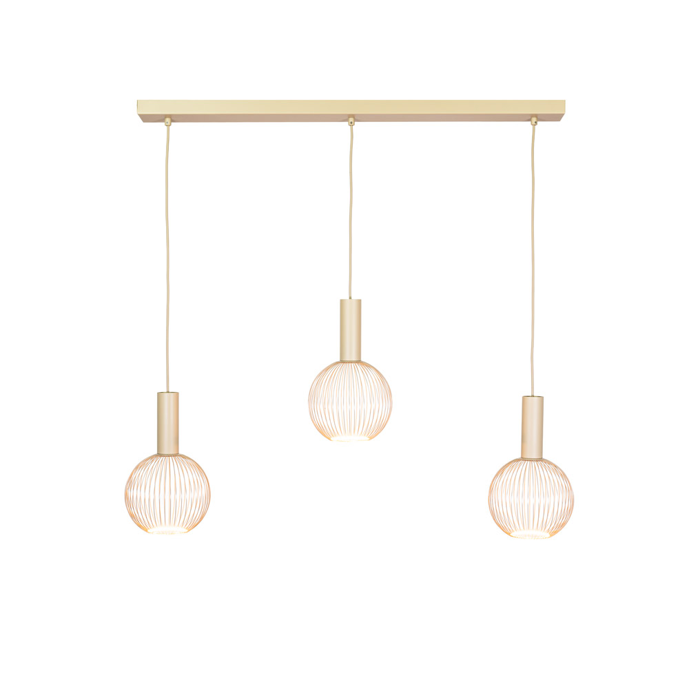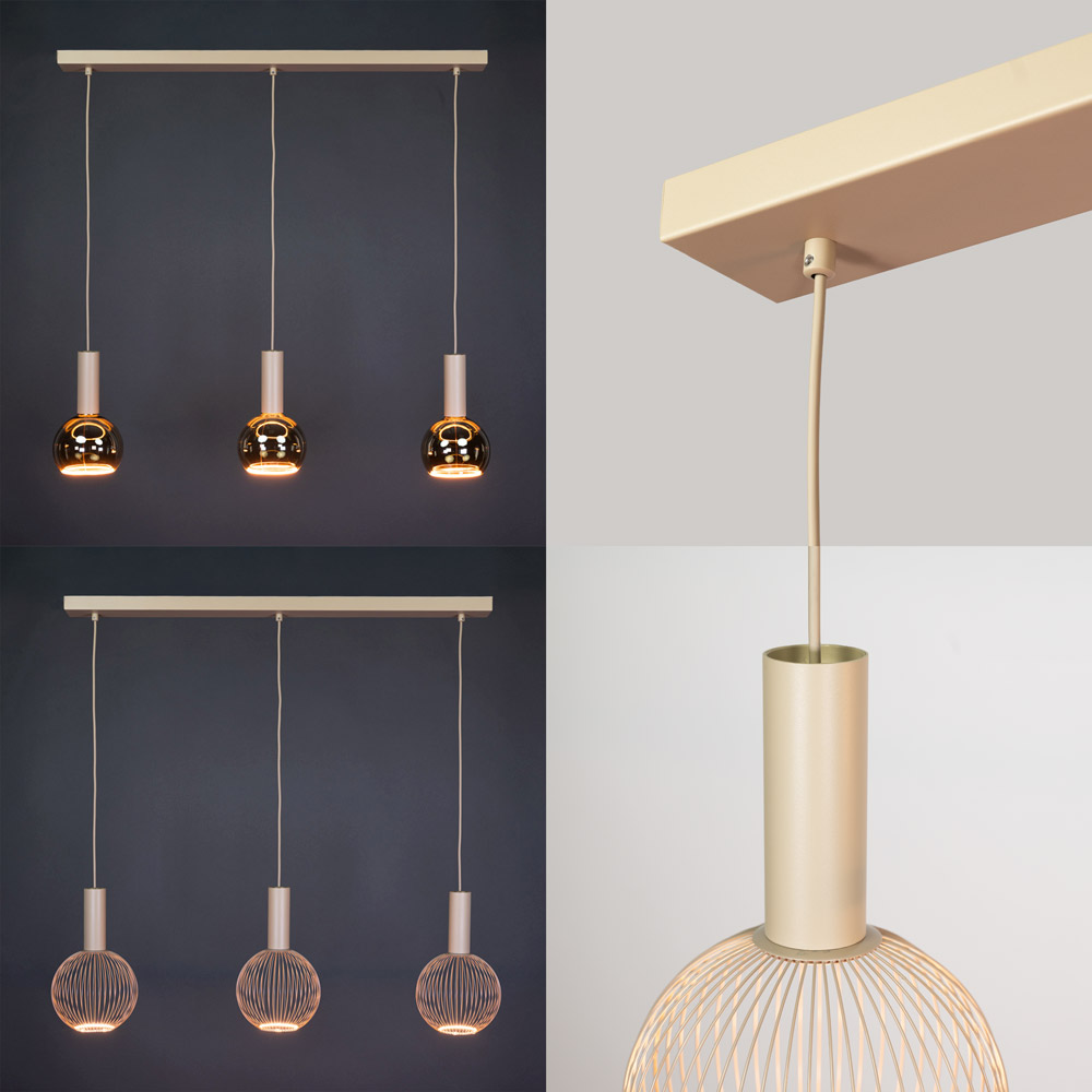 Deze 3-lichts hanglamp met balk is een stijlvolle en rustige verschijning binnen een modern of natuurlijk interieur. De langwerpige plafondbalk in beige/zand vormt een mooi geheel met de drie slanke pendels, waaraan de open, bolvormige lichtbronnen hangen. De gelijkmatige verdeling van de pendels zorgt voor een rustig en uitgebalanceerd beeld boven tafel of kookeiland.
