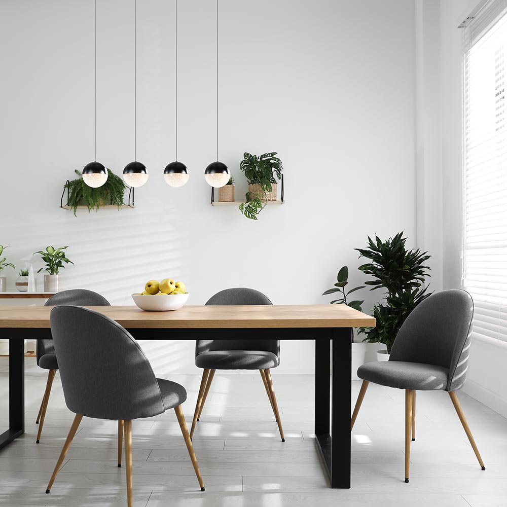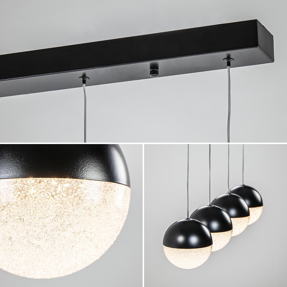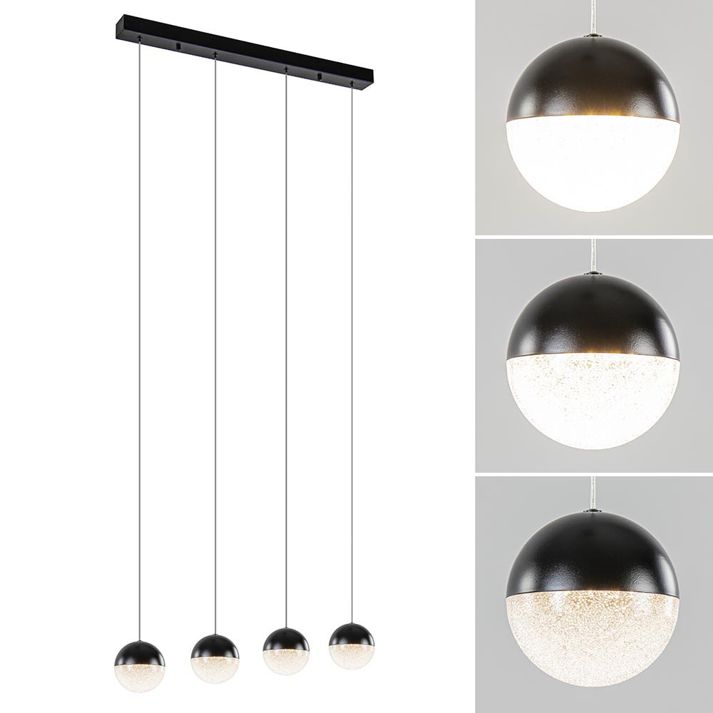 Een leuke moderne hanglamp met een sfeervol effect. Deze 4-lichts hanglamp zwart is gecombineerd met diamant zand wat voor een sfeervolle verlichting zorgt. Ideaal aan de LED-hanglamp is ook dat deze is voorzien van een 3-standen functie. Dit houdt in dat u de lamp gemakkelijk kunt dimmen d.m.v uw wandschakelaar. Er is dus geen externe dimmer nodig. Met een druk op de knop schakelt u snel tussen de 3 scènes en creëert u gemakkelijk de gewenste sfeer. Ideaal tijdens het dineren en natafelen. De vier bollen zijn half zwart en half diamant zand wat mooi is verwerkt in een kunststof kap. De LED bollen hangen aan soepele draden die naar wens zijn in te korten en de 4-lichts LED hanglamp wordt met een zwarte plafondbalk opgehangen.