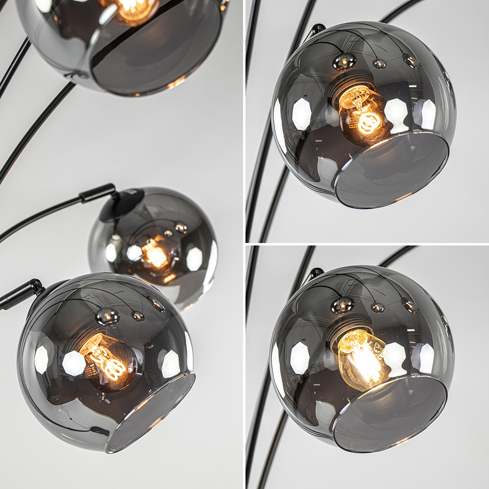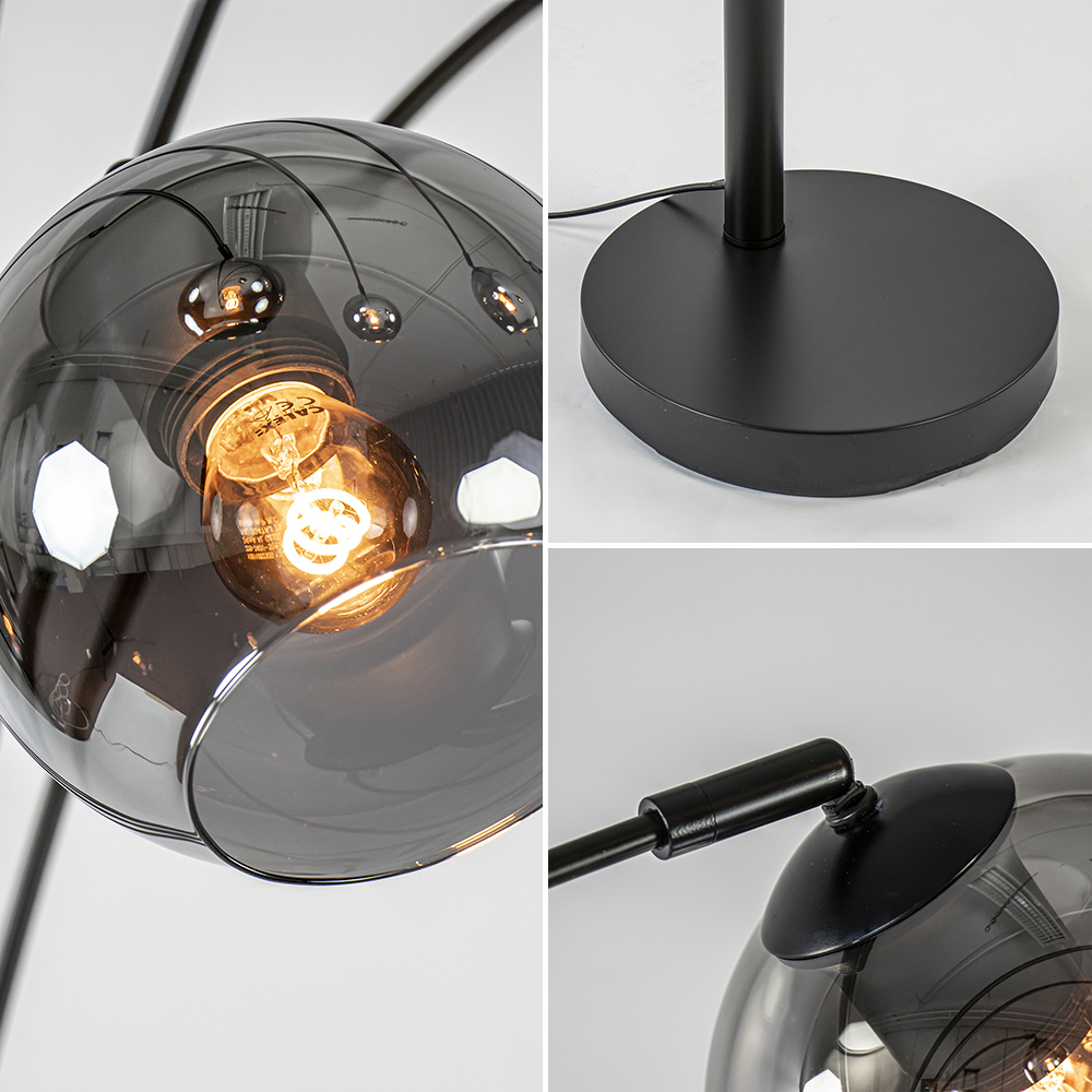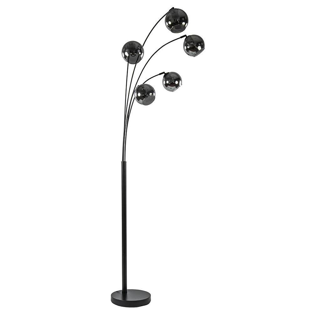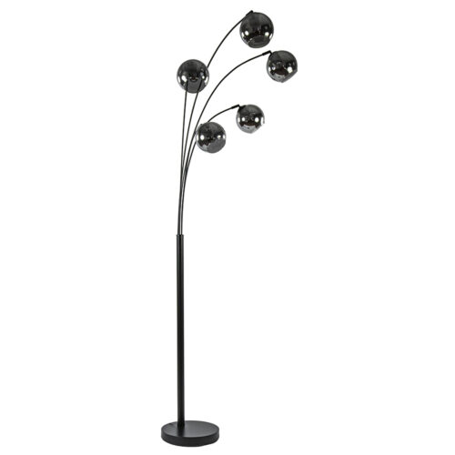 Ideaal voor in een donkere hoek of naast de bank. Deze moderne vloerlamp heeft een stijlvolle en luxe uitstraling die mooi is te combineren in de huidige woonstijlen. De staande lamp heeft een mat zwart armatuur met verstelbare armen. Iedere arm is voorzien van een smoke glazen bol die ook nog kan kantelen en draaien. Zo kunt u de vloerlamp helemaal naar wens vormgeven. Bundel de armen bij elkaar of spreid ze juist voor een speelsere uitstraling. De moderne vloerlamp heeft een zwart snoer met schakelaar en wordt geleverd exclusief lichtbronnen.