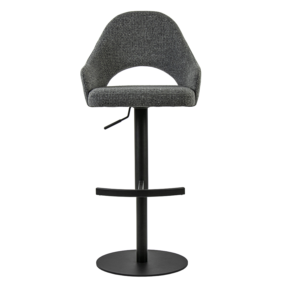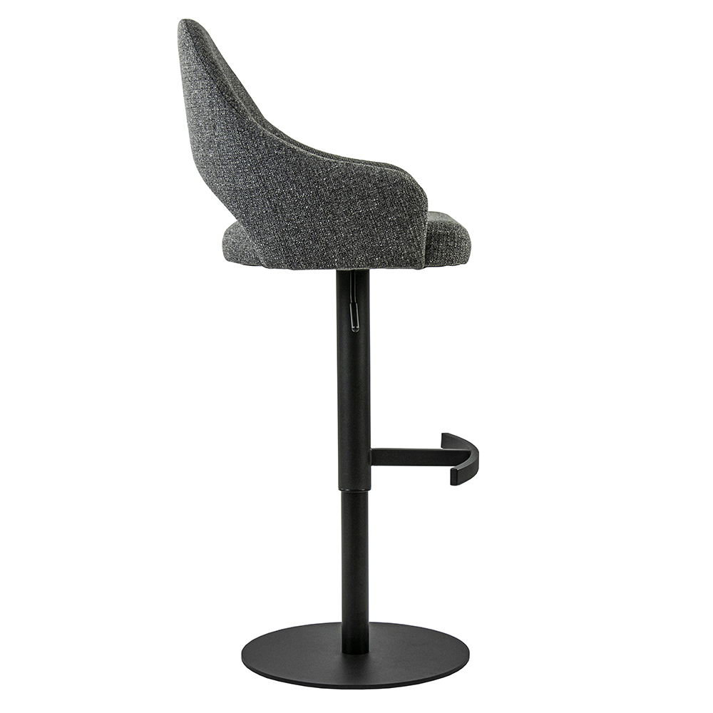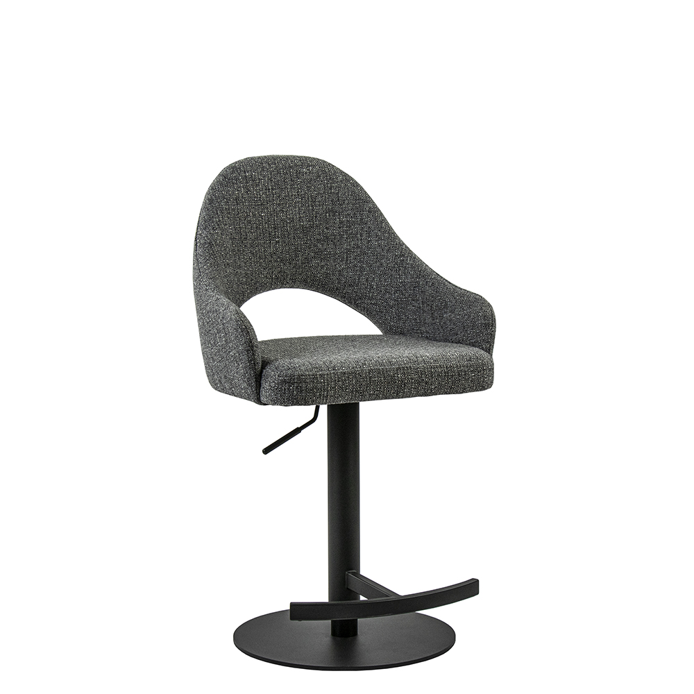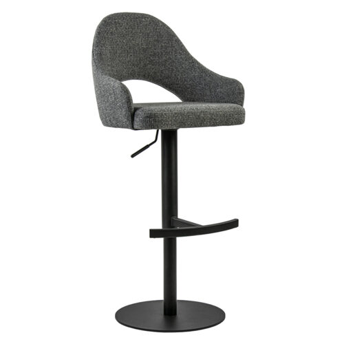 Deze moderne barkruk maakt de keuken of bar helemaal af. De barstoel heeft een fijn zitcomfort en is in hoogte te verstellen. De voetensteun biedt extra support en helpt bij het op en afstappen van de kruk. De zitting is volledig van stof en uitgevoerd in het donker grijs. De metalen poot is voorzien van een mat zwarte finish en gemakkelijk in hoogte te verstellen dmv de hendel onder de zitting.