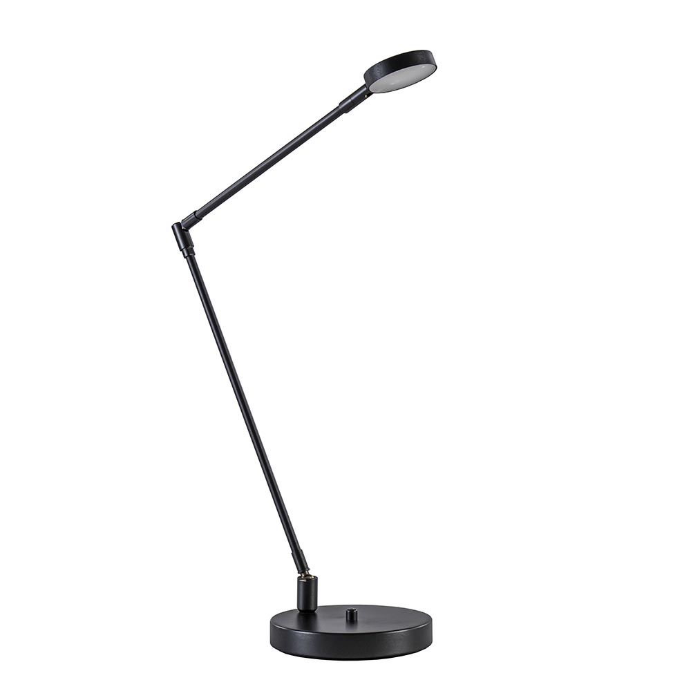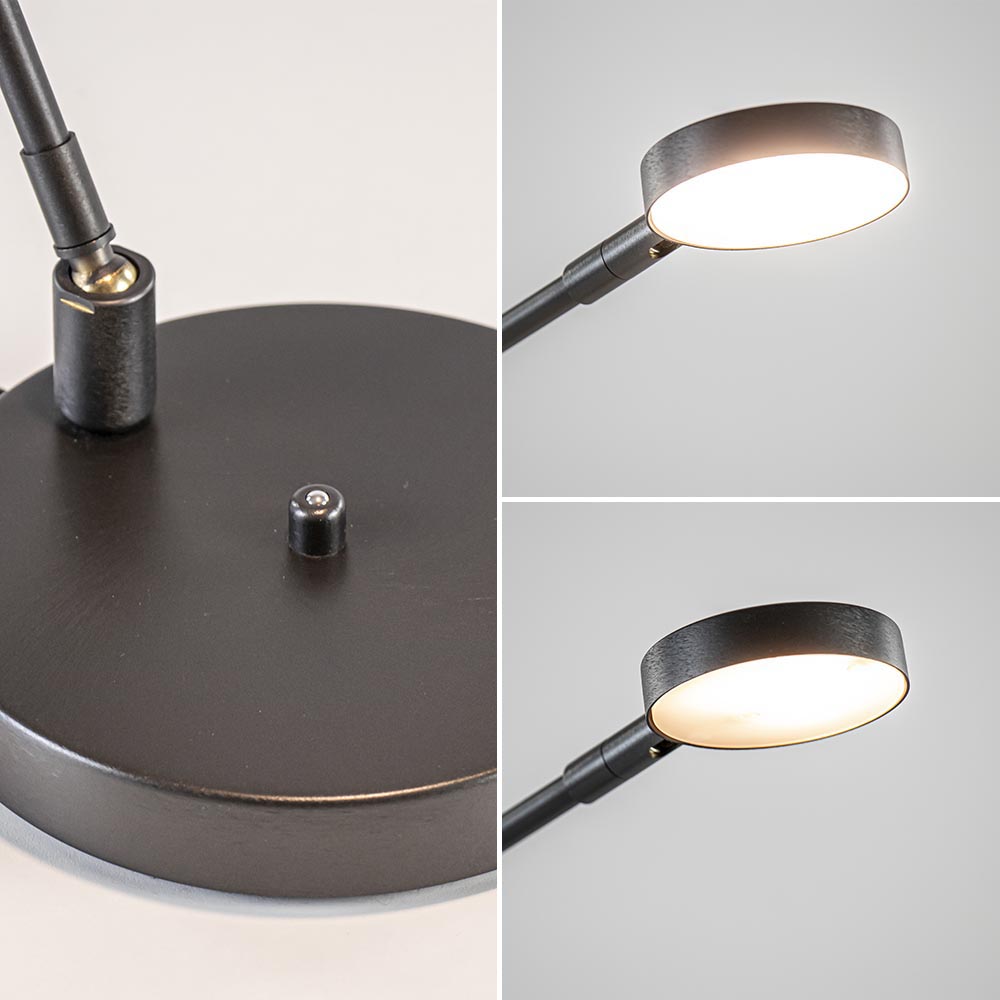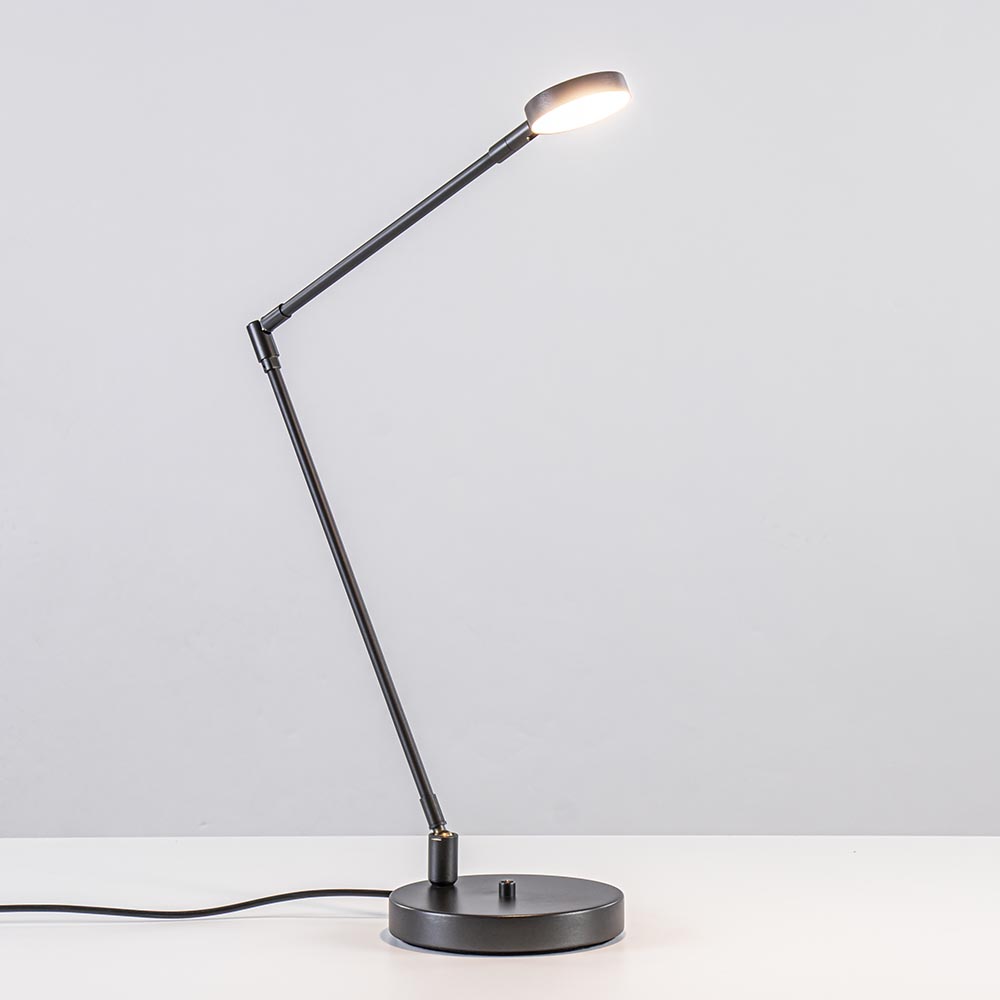 Een mooie design bureaulamp inclusief LED. Het LED is dimbaar en voorzien van een dim to warm functie, wanneer de lamp dimt wordt deze ook warmer van kleurtemperatuur. Ideaal om de gewenste sfeer te creëren. De moderne bureaulamp is verstelbaar op 3 plekken, op de voet, halverwege de arm en bij de kap. Zo kunt u de lamp naar wens verstellen om bij te werken, lezen of gewoon wat extra sfeer te maken. De LED tafellamp is gemaakt van geborsteld staal en uitgevoerd in het zwart.