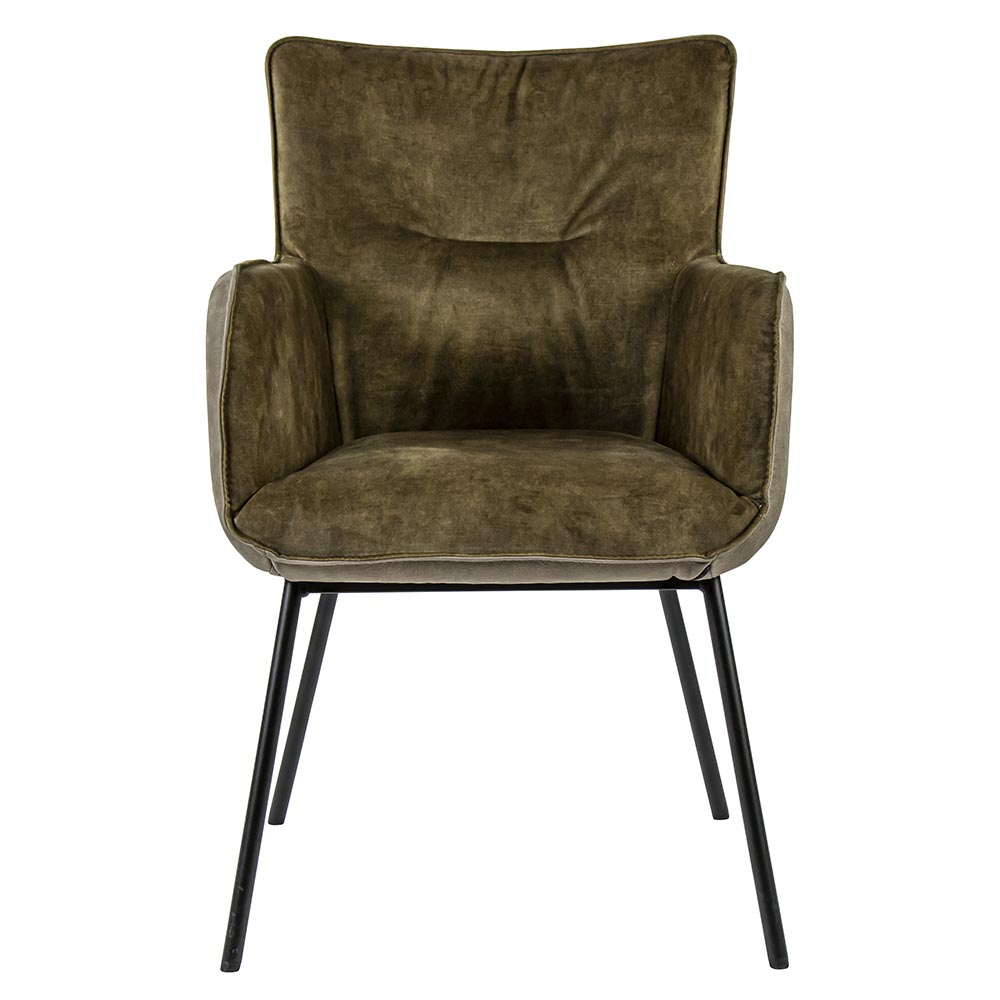 Deze prachtige eetkamerstoel is een verrijking voor het interieur. De armstoel is uitgevoerd in het leder met stof wat de stoel een luxe uitstraling geeft. Het leder is uitgevoerd in het taupe en de stoffen zitting in het velours in een groen/bruine tint. De stoel heeft een hoog zitcomfort dat wordt versterkt door de armleuningen. De slanke metalen pootjes zijn afgewerkt met een mat zwarte finish en geven de stoel een moderne touch.