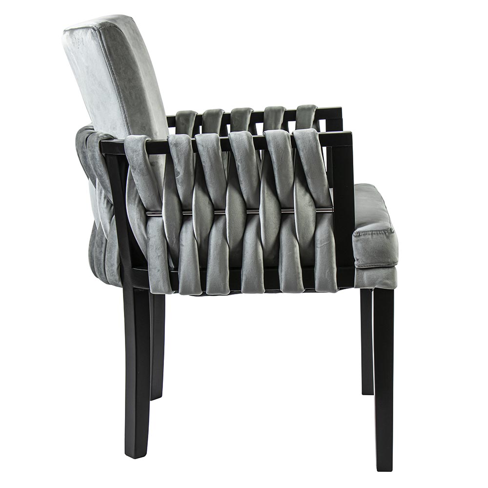– afm: 61x62x87 cm – zithoogte: 49 cm – zitdiepte: 47 cm – zitbreedte: 50 cm – armleuning: 67 cm – materiaal zitting: stof, velours – kleur zitting: grijs – materiaal poot: hout – kleur poot: zwart – decor: zilver