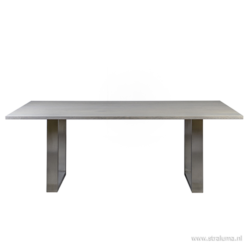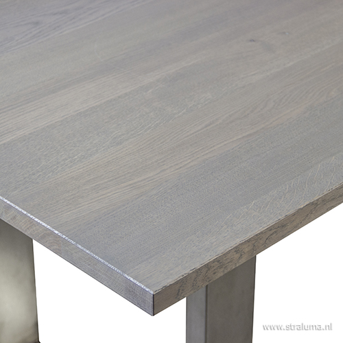 Deze prachtige eettafel gemaakt van eikenhout is uitgevoerd met een zogenaamd vergrijsd blad wat mooi contrasteert met de rvs poten. De poten zijn U frames van 55 cm breed en de tafel zelf heeft een breedte van 100 cm. Het rvs-frame is chique en stoer tegelijk en is bovendien ook erg trendy! Meubels gemaakt met gemixte materialen zijn momenteel zeer populair. De eettafel ziet er luchtig en zeker niet te plomp uit. Deze eetkamertafel staat prachtig in een modern-, Scandinavisch- of romantisch interieur. De eettafel is geschikt voor 6 personen.