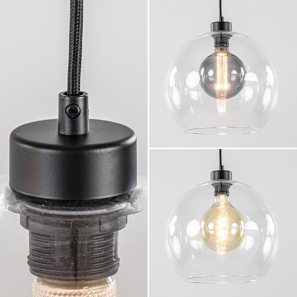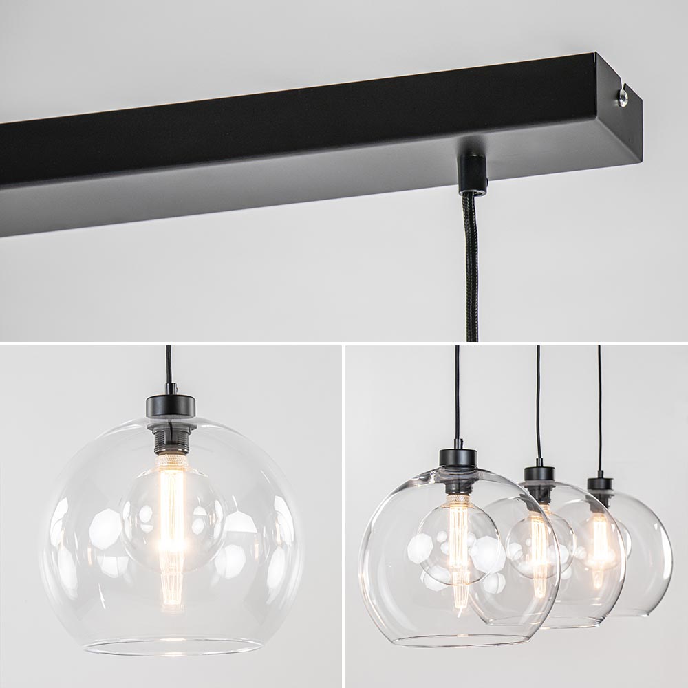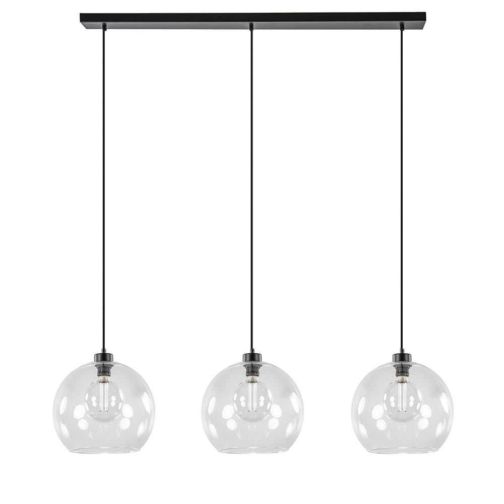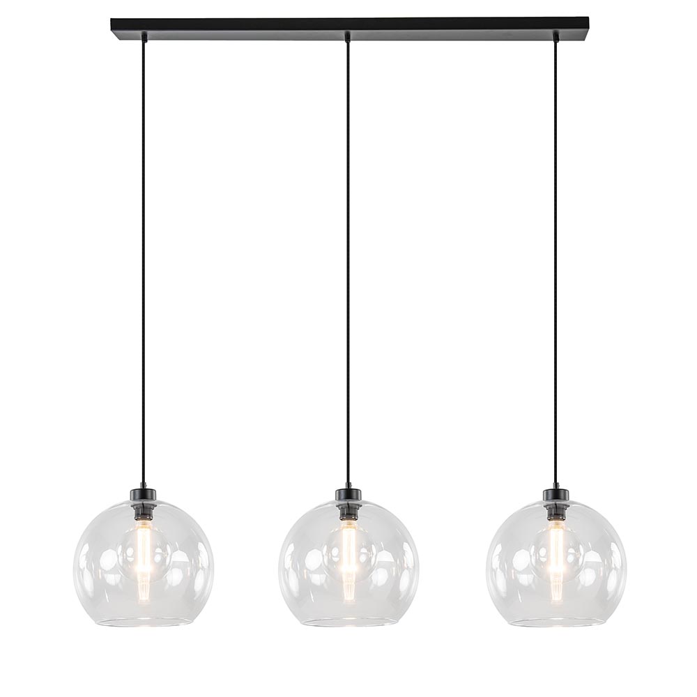 Glas is hip en trending, en kan dus ook niet ontbreken boven uw eetkamertafel. Deze 3-lichts hanglamp past daar perfect boven. De drie kappen van helder glas zorgen voor een fijne sfeer en zijn naar wens op hoogte te hangen. Liever een speels effect? Dan hangt u ze gemakkelijk op verschillende hoogtes. De glazen bollen op één lijn geeft een moderne strakke look. De hanglamp wordt aan het plafond bevestigd met een mat zwarte balk van 110 cm.
