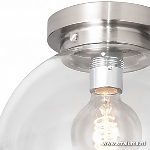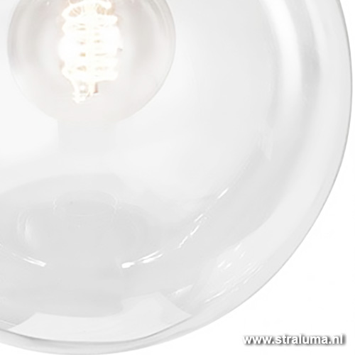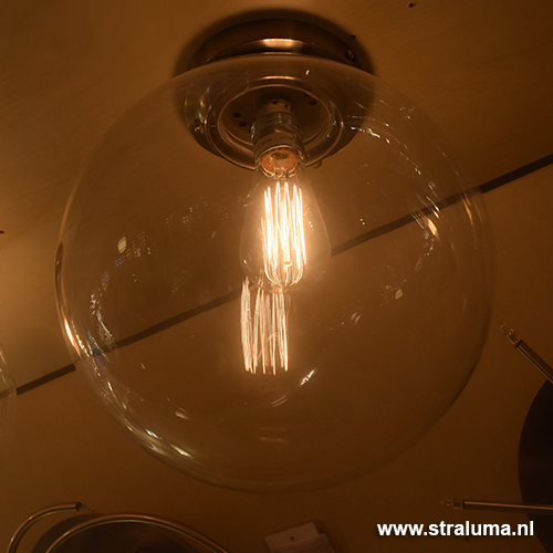 Moderne glazen plafonnière. Door het transparante glas blijft deze plafondlamp lekker licht en fris. Een leuke keuze voor een lamp als deze is een kooldraadlamp. Ideaal in de toilet, hal of slaapkamer.