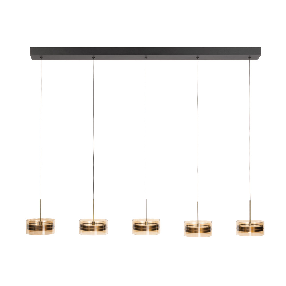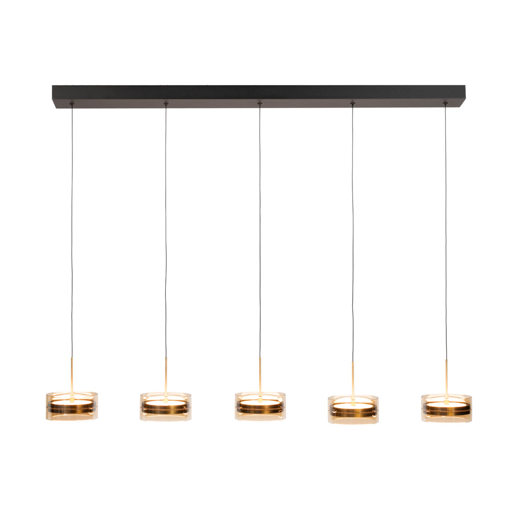 Specificaties: • Producttype: Hanglamp • Kleur: Champagne glas met zwart en goudkleurige details • Aantal lichtpunten: 5 • Afmetingen lamp: L 120 x B 9,5 x H 160 cm • Afmetingen bevestiging: L 120 x B 9,5 cm • Materiaal: Glas en metaal • Lichtbron: Geïntegreerde LED (niet vervangbaar) • Wattage: 12 watt per lichtpunt • Totaal wattage: 60 watt • Lichtopbrengst: 5400 lumen • Lichtkleur: 2700K warm wit • Dimbaar: Niet vermeld