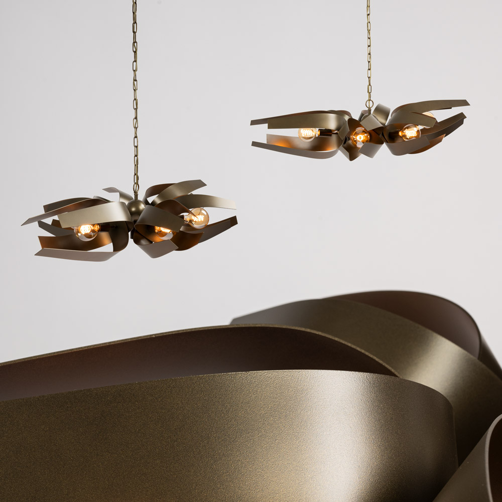 De Ott hanglamp is een echte statement lamp met een dynamisch lijnenspel van gebogen metalen elementen. De volledig bronzen afwerking geeft de lamp een warme, luxe uitstraling die perfect past binnen moderne, industriële en hotel-chic interieurs.