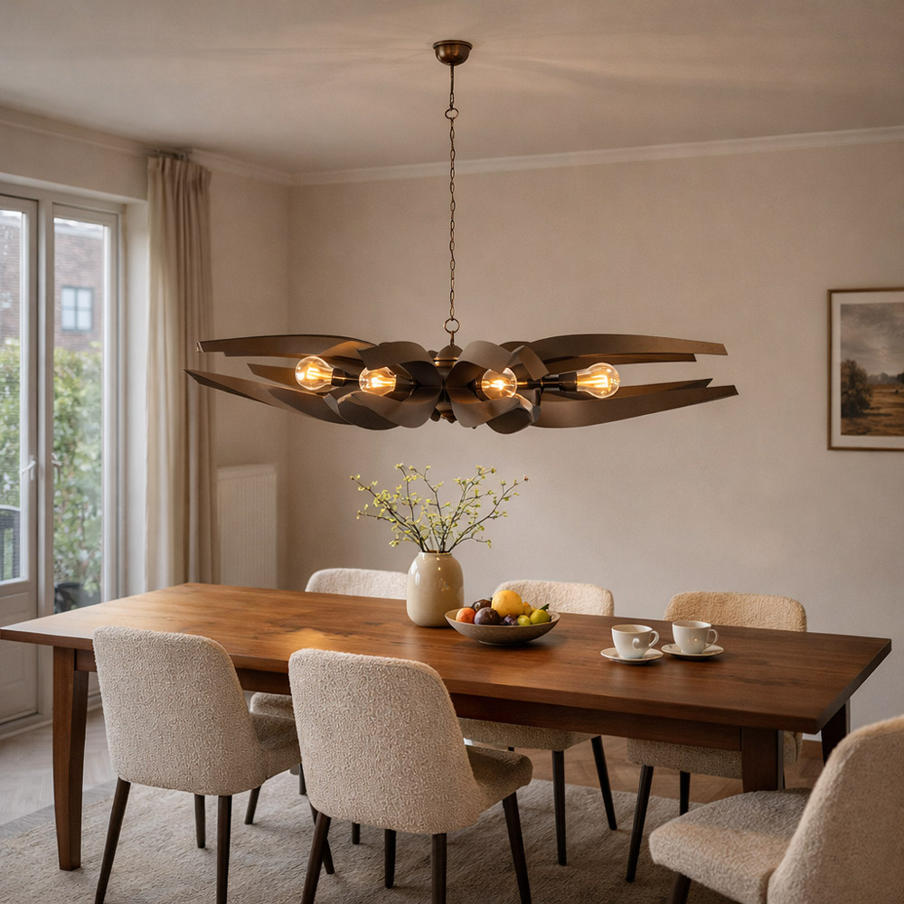 Highlights: • 6 × E27 fittingen voor sfeervol rondom licht • 1 × GU10-spot aan de onderzijde (apart schakelbaar) • Extra functioneel licht met knop op de centrale bol • Volledig uitgevoerd in warm brons • Perfect boven een grote eettafel van 220–260 cm