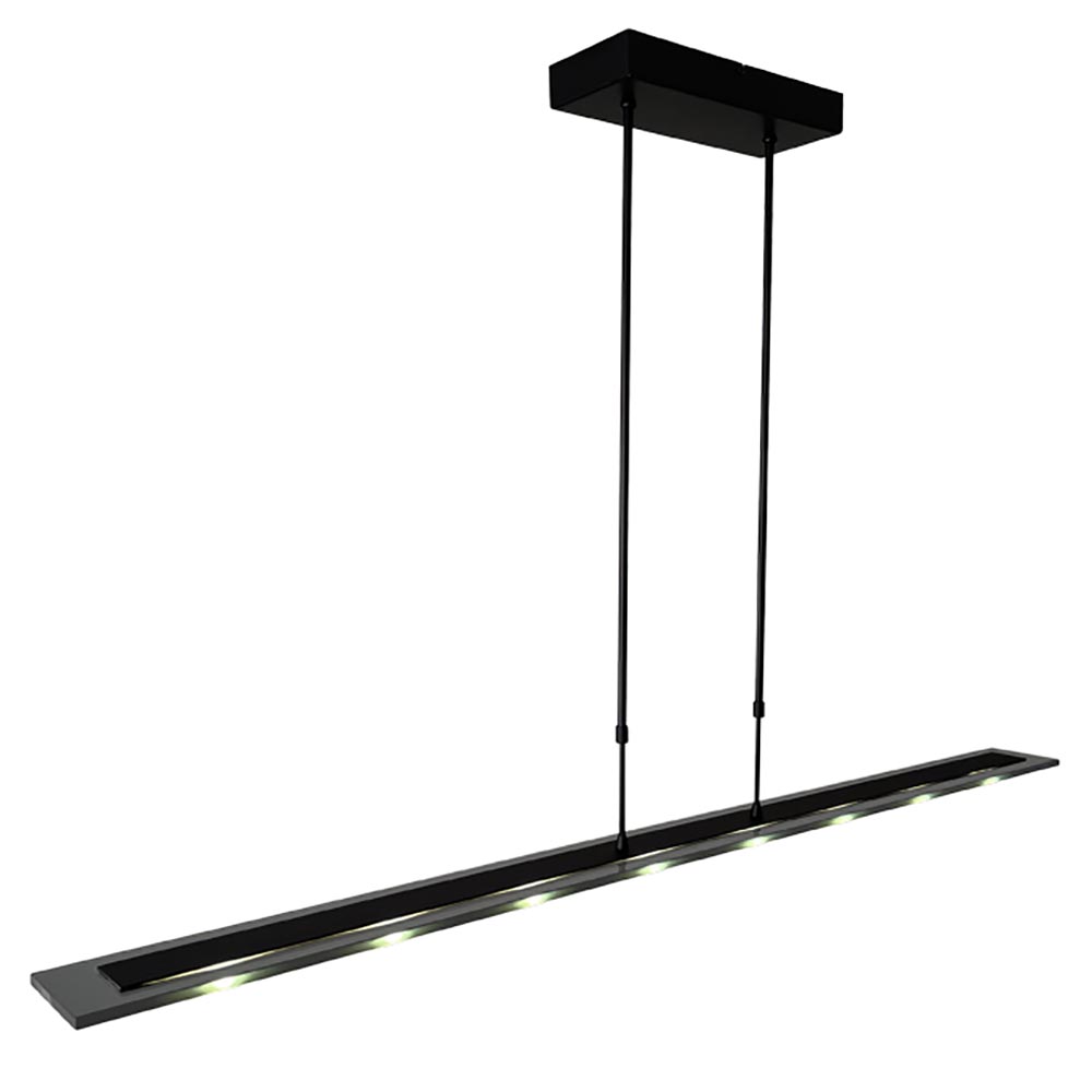Een prachtige hanglamp met een hoog design gehalte. Deze moderne hanglamp is voorzien van LED met een dim to warm functie. Door middel van de pushdimmer op het armatuur creëert u gemakkelijk de gewenste lichtintensiteit en kleurtemperatuur tussen de 2200 en 2700 Kelvin. Met 4080 lumen geeft de luxe hanglamp een goede lichtopbrengst. Ideaal voor boven een eettafel of bureau. De lamp is naast de eetkamer dan ook prima geschikt voor een kantoorruimte. De langwerpige lamp is uitgevoerd in het mat zwart en voorzien van smoke glas. Deze combinatie geeft de hanglamp echt een luxe en chique uitstraling en maakt de lamp ook geschikt voor diverse woonstijlen. De hanglamp is verstelbaar in hoogte en heeft een minimale hoogte van 78 cm, en een maximale hoogte van 145 cm.