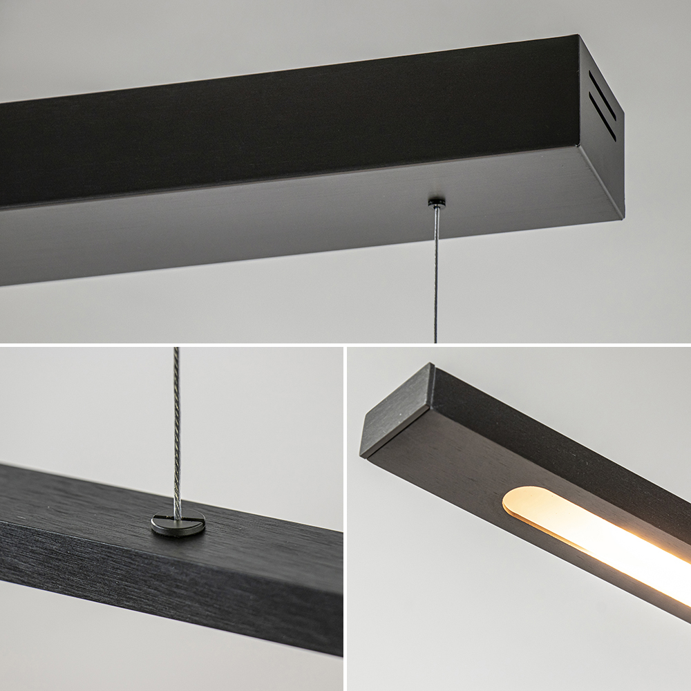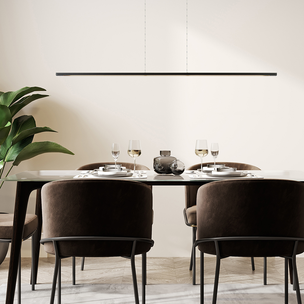 Deze prachtige LED hanglamp is een verrijking voor het interieur. De moderne hanglamp heeft een minimalistisch en strak design dat is voorzien van de meest innoverende technologie. Zo kunt u de lamp gemakkelijk in hoogte verstellen dmv het catrol systeem. Door de balk omlaag te trekken bepaald u gemakkelijk en snel de juiste hoogte. Het systeem in de bevestiging zorgt dat de kap blijft hangen op de hoogte waar u loslaat. Toch liever iets hoger, geen probleem, u duwt de kap gemakkelijk weer wat omhoog waardoor de snoeren weer wat intrekken. Verder is de langwerpige kap van 130 cm ook dimbaar met een sensor. Met handgebaren kunt u de verlichting snel bedienen door de intensiteit en keur te veranderen. Geen gedoe met externe dimmers of schakelaars. De moderne hanglamp is uitgevoerd in het zwart nikkel en heeft een magnetische plafondbevestiging.