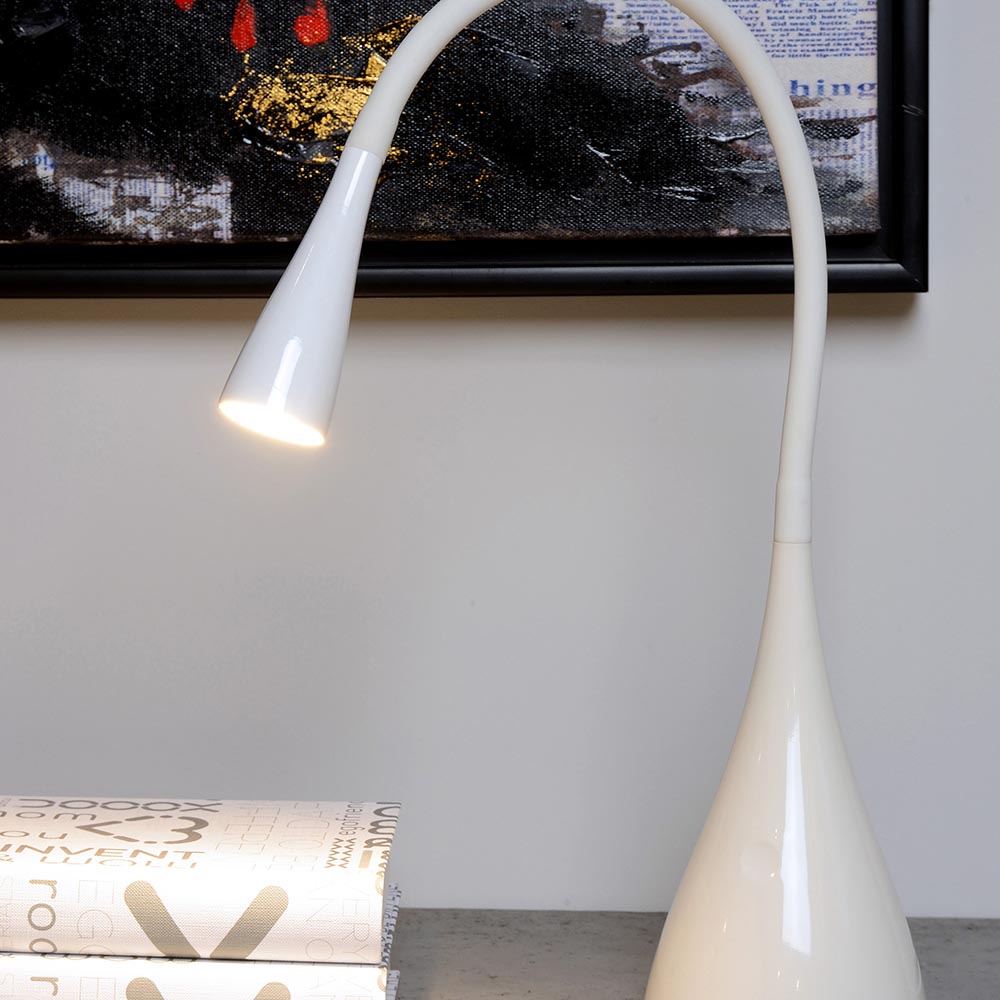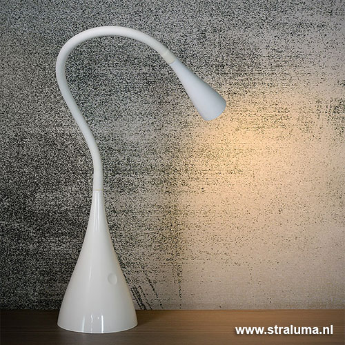Deze speelse bureaulamp Zozy is een zeer veelzijdige lamp. Geschikt als bureaulamp, tafellamp of als leeslamp op uw nachtkastje. De witte glanzende kunsstof basis, de flexibele hals maken van deze lamp een must-have. De 3-standen touch dimmer zorgt voor altijd de juiste hoeveelheid licht en de warm witte 3W LED maakt hem nog energiezuinig ook.