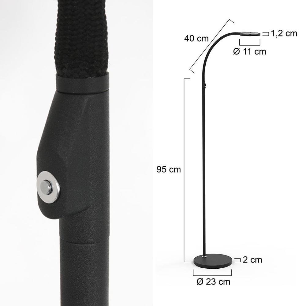 Een ideale vloerlamp voor zowel functioneel als sfeerlicht. Deze moderne leeslamp is van meerdere gemakken voorzien. Naast het strakke design heeft de leeslamp een flexibele arm zodat u de kap naar wens kunt verstellen. Deze is verder voorzien van LED verlichting welke dimbaar is middels de pushdimmer op het armatuur. De verlichting is zowel in intensiteit als kleur te dimmen. Zo kunt u gemakkelijk schakelen tussen licht om bij te lezen of een sfeervol licht voor bij een borrel. De mat zwarte LED leeslamp heeft een zwart snoer met een lengte van 180 cm.