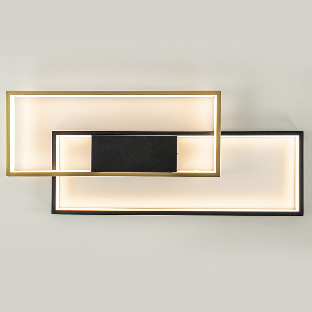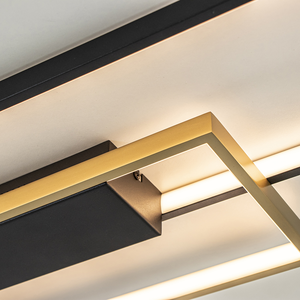 Deze strak vormgegeven plafondlamp maakt uw interieur helemaal af. Ideaal in ruimtes met een laag plafond maar natuurlijk ook toe te passen in andere ruimtes. De zwarte met gouden plafonnière bestaat uit twee rechthoeken die speels op elkaar zijn gezet. Beide zijn aan de binnenzijde voorzien van een LED strip die met 2700 Kelvin een sfeervolle verlichting geeft. Ideaal aan deze zwarte plafondlamp is dat deze in 3-standen dimbaar is via de gewone wandschakelaar. U heeft hier dus geen externe dimmer voor nodig. Wanneer u de lamp inschakelt start deze op volledige intensiteit, schakelt u de lamp direct weer uit en aan, dan dimt deze naar een zachtere intensiteit. Doet u dit nogmaals dan is de LED lamp op zijn zachts gedimt. Zo creëert u gemakkelijk en snel de gewenste sfeer.