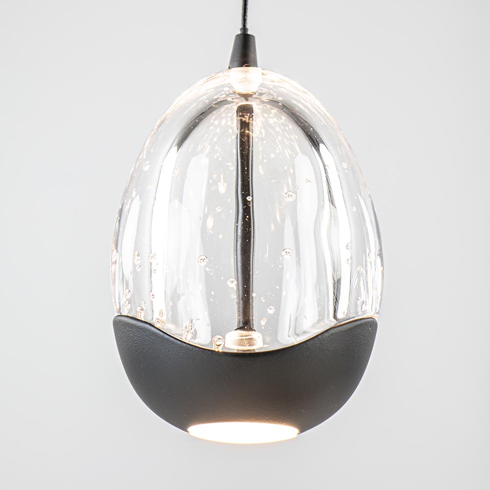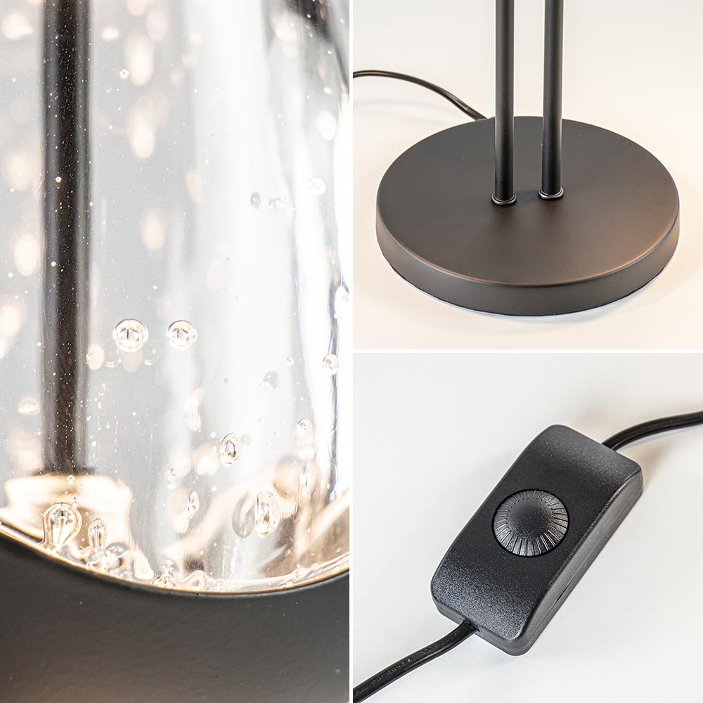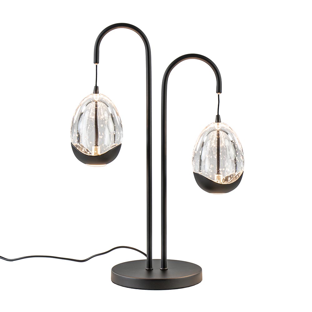Een sfeervolle toevoeging voor op een dressoir, bijzettafel of zelfs het nachtkastje. De 2 kapjes zijn gevormd als een ei en voorzien van LED verlichting. De kapjes zijn deels van massief glas en deels matzwart metaal. Ook het frame is mat zwart. Dit geeft de lamp een stoere uitstraling. Het glas is voorzien van luchtbelletjes wat de tafellamp een speels effect geeft. De verlichting geeft direct licht naar beneden door middel van de spot onderop het ei, en daarnaast ook indirect licht doordat het ei van binnenuit verlicht wordt. Dit tafellampje is gemakkelijk te dimmen met de bijgeleverde dimmer. De dimmer van de lamp bevindt zicht op 40 CM van het armatuur.