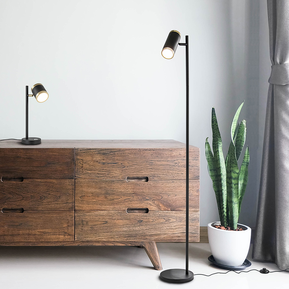 Deze mat zwarte vloerlamp met gouden accenten is een verrijking voor het interieur. De vloerlamp is voorzien van een spot die naar wens is te verstellen. Zo kunt u de spot kantelen en draaien. Ideaal voor naast de bank of in een donkere hoek. De spot is voorzien van LED verlichting en is ook nog eens in 3 standen te dimmen. Dit werkt gemakkelijk door de schakelaar meerdere malen in te drukken, er is geen externe dimmer voor nodig. Schakel dus snel tussen lees en sfeerlicht met deze handige vloerlamp. De moderne staande LED lamp heeft een snoer met een lengte van 210 cm en een schakelaar op 55 cm van de voet.