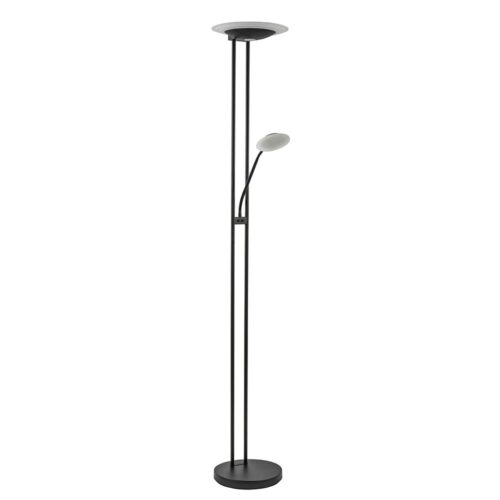 Een prachtige vloerlamp die voorzien is van meerdere functies. De vloerlamp is gemaakt van metaal en uitgevoerd in het mat zwart. Dit geeft de staande lamp een chique moderne look. De vloerlamp heeft 2 lichtpunten, een uplighter en een leeslamp. Beide zijn voorzien van geïntegreerd LED welke dimbaar is middels de dimmers op het armatuur. Door 1 keer te drukken veranderd de kleurtemperatuur van 2700 naar 3500 Kelvin. Drukt u nogmaals dan gaat deze door naar 4000 Kelvin en bij nog een keer drukken gaat de lamp weer uit. Houdt u de dimmer ingedrukt in een van de drie standen, dan dimt de lamp in intensiteit. Dit geldt voor zowel de uplighter als de leeslamp. De leeslamp heeft verder nog een verstelbare arm zodat u gemakkelijk uw favoriete boek kunt lezen.