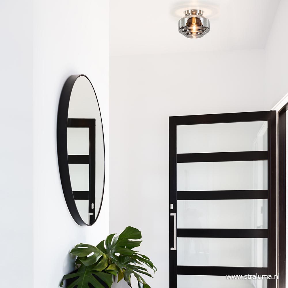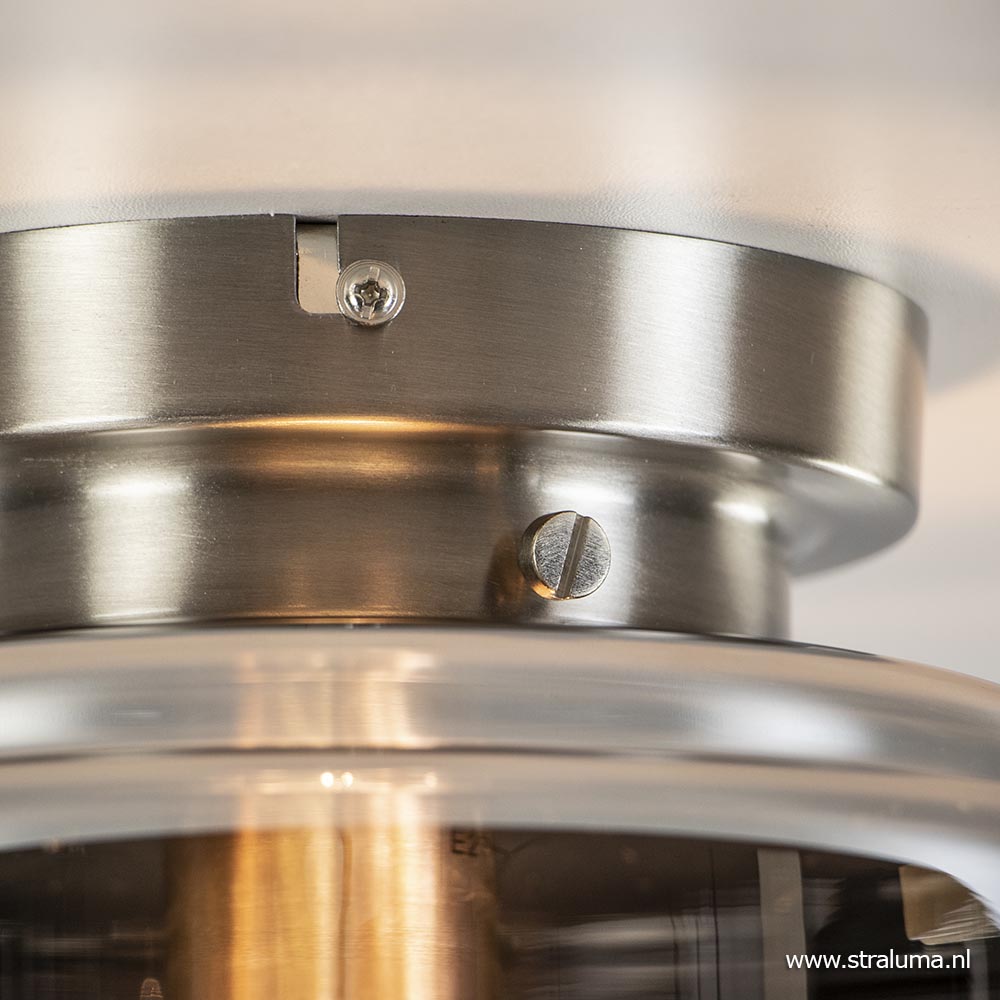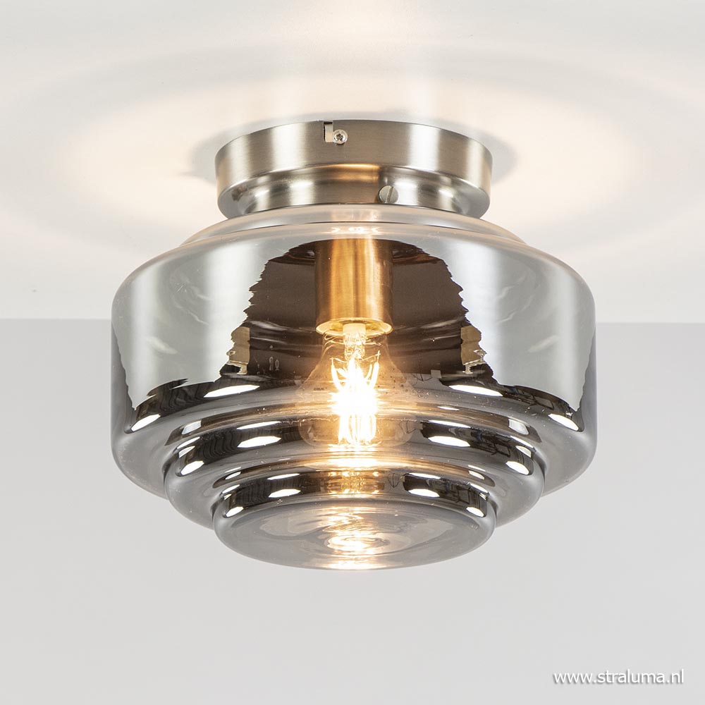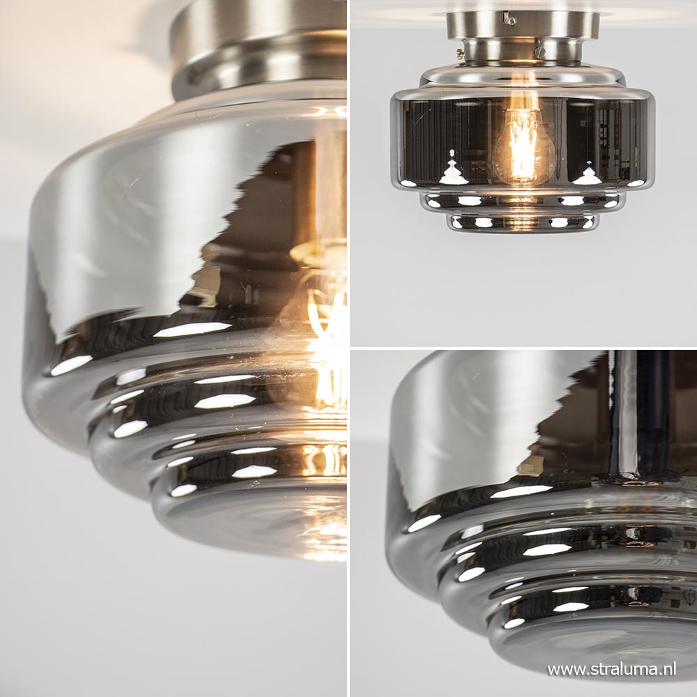 Een moderne plafondlamp met een retro tintje. De art deco achtige plafondlamp, vaak in helder of wit glas, wordt nu ook uitgevoerd in het trendy smokey glas. Het spiegelende smokey glas zorgt voor een moderne en luxe uitstraling die mooi past bij de matte nikkel bevestiging. De combinatie van het moderne en retro zorgt dat de lamp mooi is toe te passen in diverse woonstijlen en ook in diverse ruimtes. Ideaal in een hal of woon/slaapkamer.