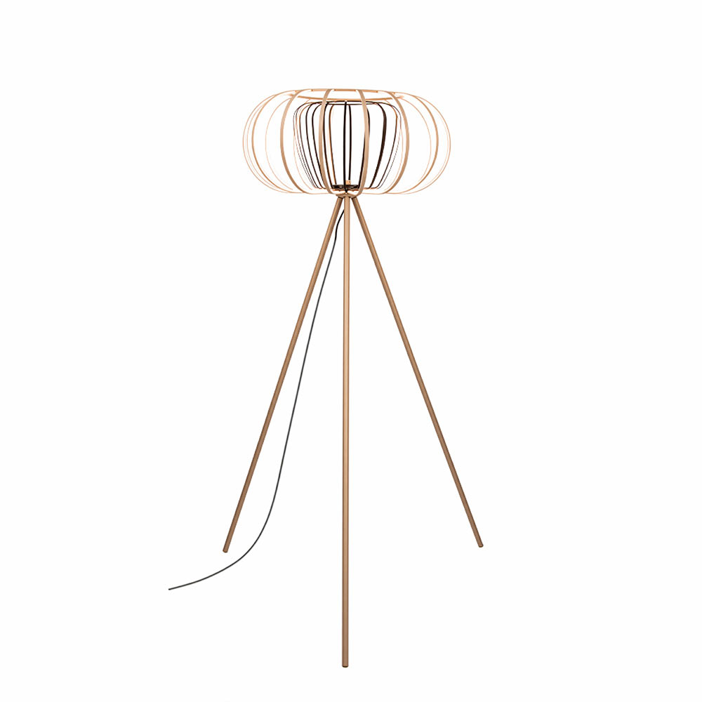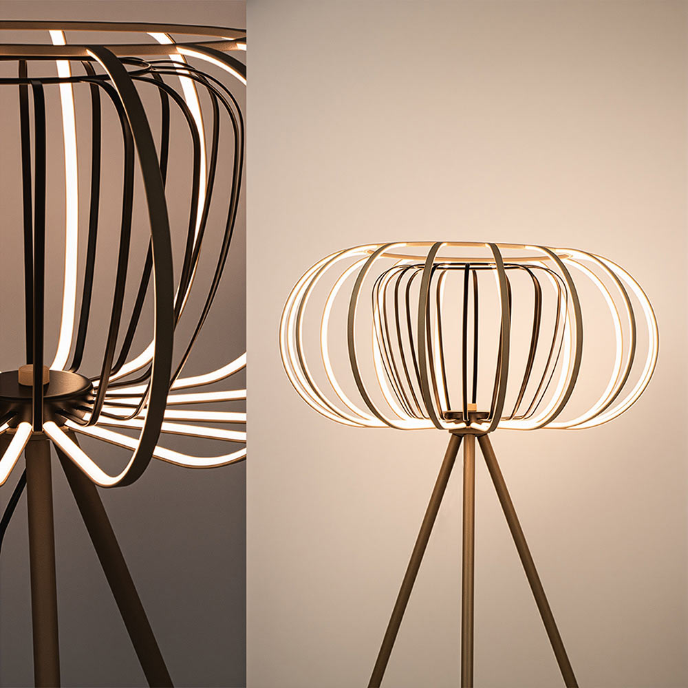 De Salo vloerlamp is een moderne eyecatcher die dankzij het speelse lijnenspel direct opvalt in je interieur. De open kap van metaal in twee kleuren (Ø54 cm) geeft de lamp een luchtige en eigentijdse uitstraling. Het slanke tripod-frame zorgt voor stabiliteit en een elegante look — ideaal voor in de woonkamer, leeshoek of slaapkamer.