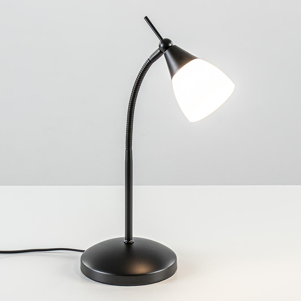Deze kleine maar functionele tafellamp brengt een hoop gemakken met zich mee. De tafellamp is heel handig te bedienen, het gehele armatuur is namelijk de aan/uit schakelaar. De volledige lamp is een touchdimmer waarmee u snel kunt schakelen tussen de 3-standen lichtintensiteit. Zo bepaald u gemakkelijk en snel de juiste sfeer. De arm is flexibele zodat u de lichtrichting zelf kunt bepalen. Het zwart metalen armatuur is gecombineerd met een opaal glazen kap die extra sfeer brengt. Deze combinatie maakt de tafellamp prima geschikt voor diverse woonstijlen als strak klassiek, modern of retro. De moderne tafellamp touchy heeft een snoer met een lengte van 180 cm.