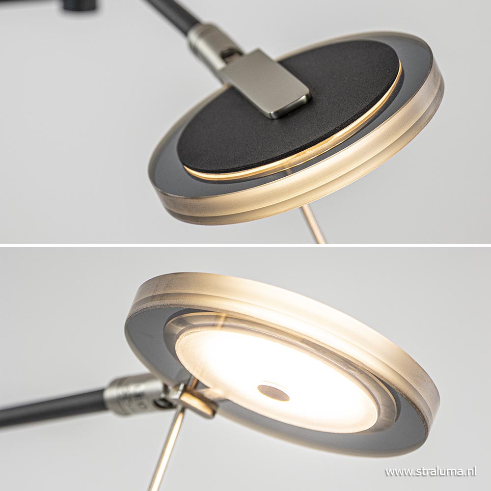 Een mooie luxe versie van een klassieke uplighter. De moderne vloerlamp is vervaardigd uit metaal en afgewerkt met een mat zwarte finish. Het zwart is mooi gecombineerd met smoke glas, waardoor de lamp een extra luxe uitstraling krijgt. Naast de mooie uitstraling is de lamp ook zeer functioneel. Zo kunt u de leesarm in hoogte en lengte verstellen en is de kap te draaien en te kantelen zodat u deze gemakkelijk naar de juiste richting kunt plaatsen. De uplighter en de leeslamp zijn los van elkaar te bedienen en te dimmen d.m.v de twee dimmers midden op het armatuur. Één keer drukken en de lamp gaat aan, houdt u de dimmer langer ingedrukt dan dimt deze totdat u weer loslaat. De moderne vloerlamp is volledig voorzien van LED en geeft een sfeervolle warm witte verlichting. De uplighter met leeslamp heeft een zwart snoer van 235 cm.