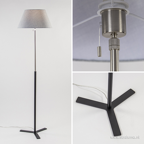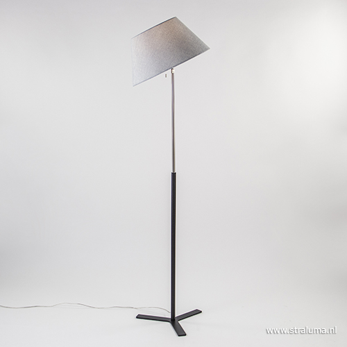 Een lamp met kap hoeft niet saai te zijn. Deze moderne vloerlamp laat dat maar al te goed zien. De lamp heeft de naam Bendy en doet zijn naam ook eer aan. Het speelse effect om de kap schuin op de lamp te zetten geeft net even een moderne twist aan de lamp. Liever de kap recht, dan is dat geen probleem, de grijze kap is gemakkelijk te kantelen. De lamp heeft een mat zwart metalen voet die overloopt in chroom. De vloerlamp wordt gemakkelijk aan/uit geschakeld met het trektouwtje bij de fitting en wordt geleverd met transparant snoer.