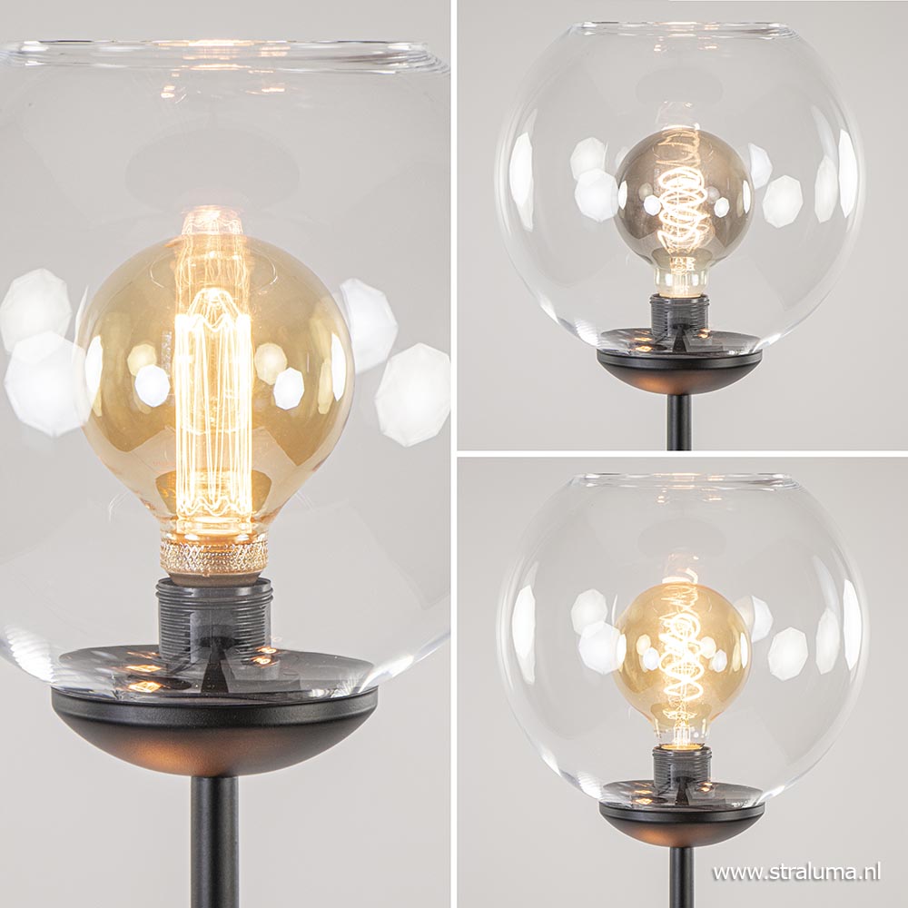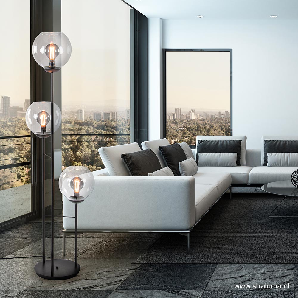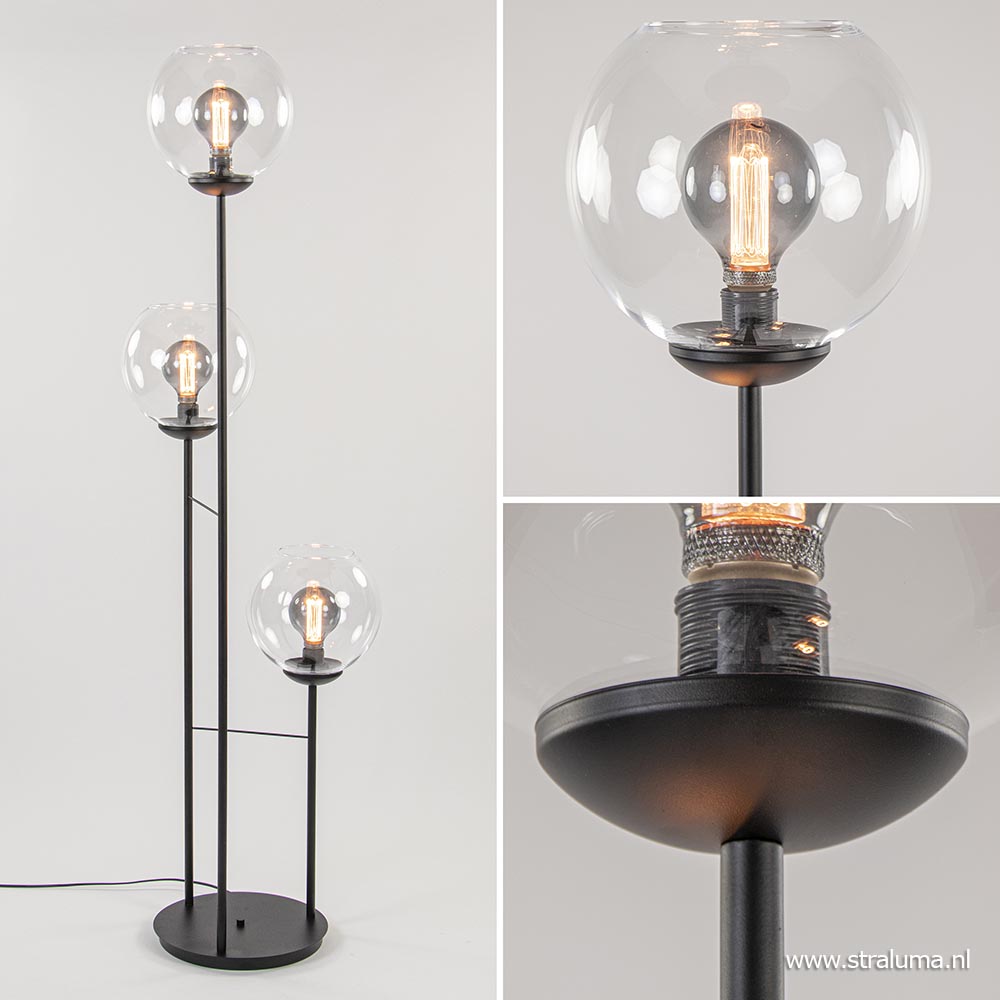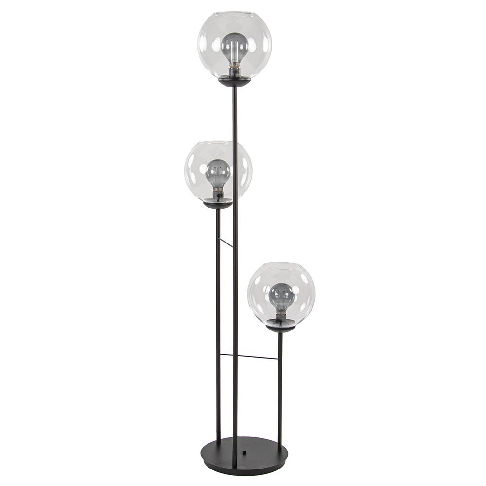 Glazen lampen zijn een trend die we al even zien, maar veelal in hanglampen. Deze vloerlamp maakt die trend helemaal compleet. De moderne vloerlamp heeft een mat zwart armatuur met drie stangen die in verschillende hoogtes zijn verdeeld. Ieder is voorzien van een helder glazen bol die wordt ondersteund door een brede fitting. De glazen bollen zijn ambachtelijk geproduceerd en hebben aan de bovenzijde een opening zodat u gemakkelijk de lichtbron kunt plaatsen. Door het heldere glas zijn diverse opties mogelijk zoals ook op de foto’s is te zien. De vloerlamp met glazen bollen heeft een zwart snoer van 330 cm met een vloerschakelaar op 195 cm van de lamp en wordt exclusief lichtbron geleverd (3x E27).