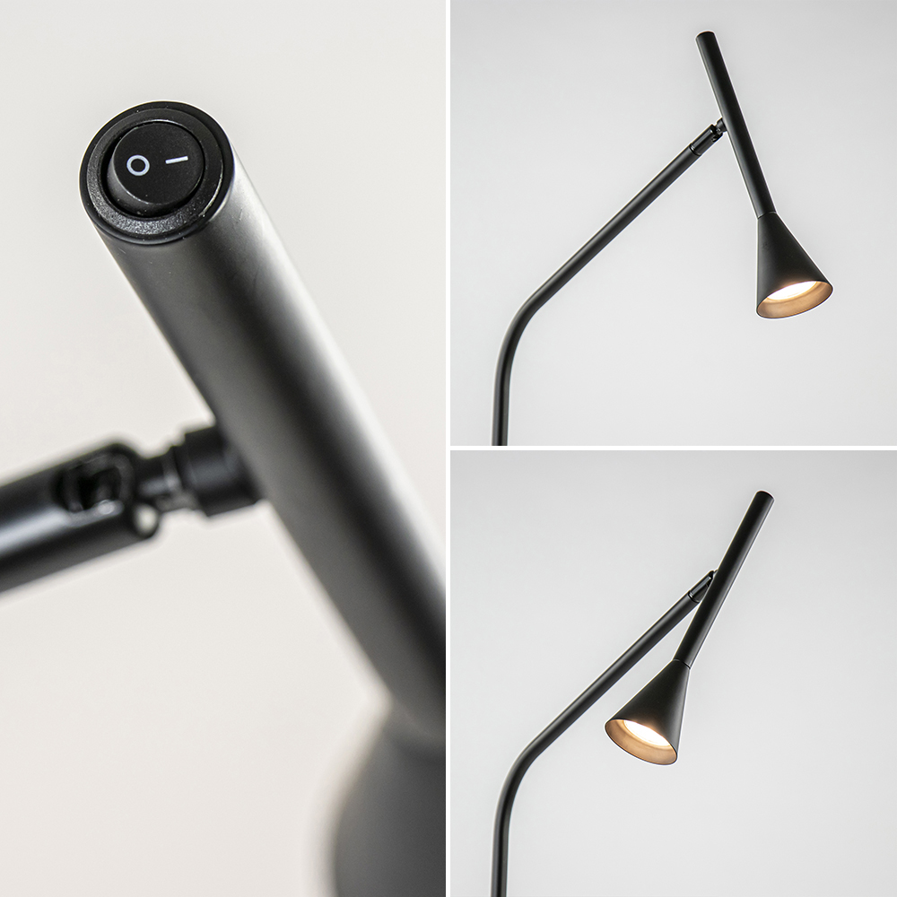 Een moderne vloerlamp met een retro look en feel. De staande lamp heeft een metalen armatuur dat is uitgevoerd in het zwart. De vloerlamp heeft een slank design dat is voorzien van een verstelbare kap. Deze kan kantelen en draaien zodat u de lamp naar wens kunt toepassen. Ideaal als leeslamp en voor het uitlichten van een donkere hoek. De zwarte vloerlamp heeft een schakelaar op het armatuur en in het snoer. Zo kunt u de lamp gemakkelijk bedienen.