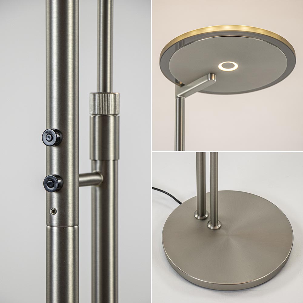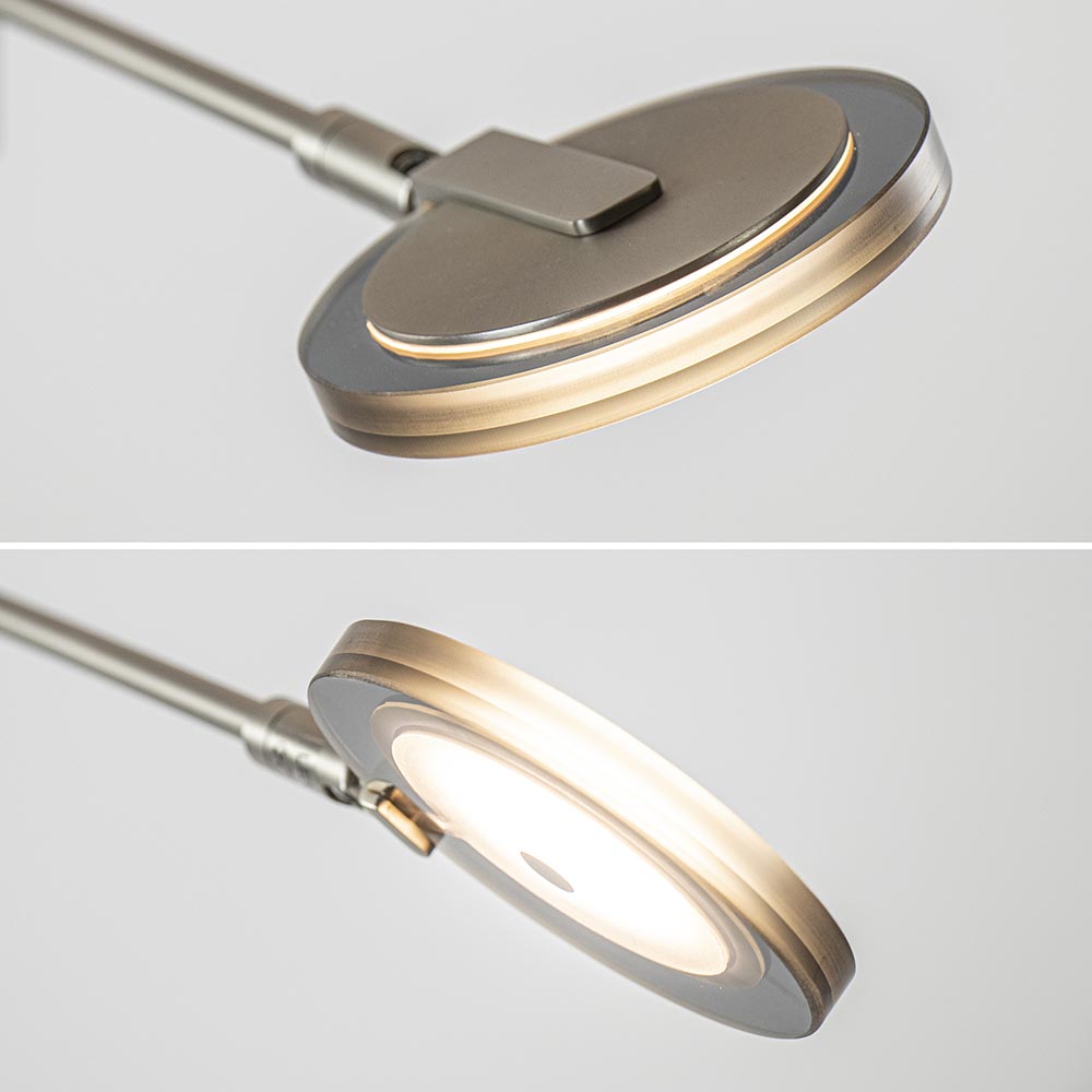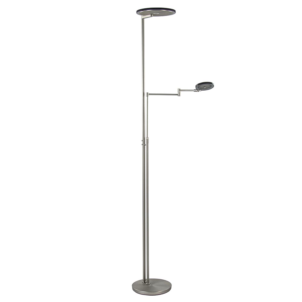 Een mooie luxe versie van een klassieke uplighter. De moderne vloerlamp is vervaardigd uit staal en is mooi gecombineerd met smoke glas, waardoor de lamp een extra luxe uitstraling krijgt. Naast de mooie uitstraling is de lamp ook zeer functioneel. Zo kunt u de leesarm in hoogte en lengte verstellen en is de kap te draaien en te kantelen zodat u deze gemakkelijk naar de juiste richting kunt plaatsen. De uplighter en de leeslamp zijn los van elkaar te bedienen en te dimmen d.m.v de twee dimmers midden op het armatuur. Één keer drukken en de lamp gaat aan, houdt u de dimmer langer ingedrukt dan dimt deze totdat u weer loslaat. De moderne vloerlamp is volledig voorzien van LED en geeft een sfeervolle warm witte verlichting. De uplighter met leeslamp heeft een zwart snoer van 235 cm.