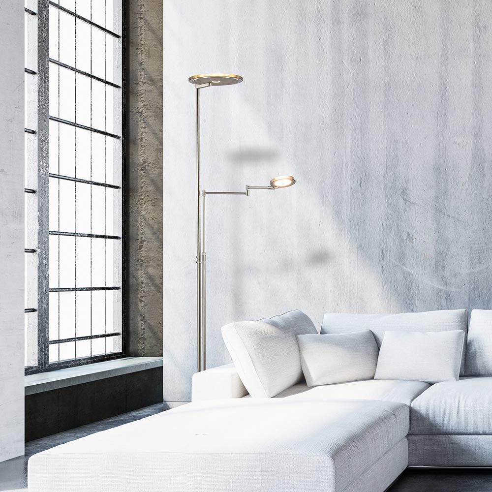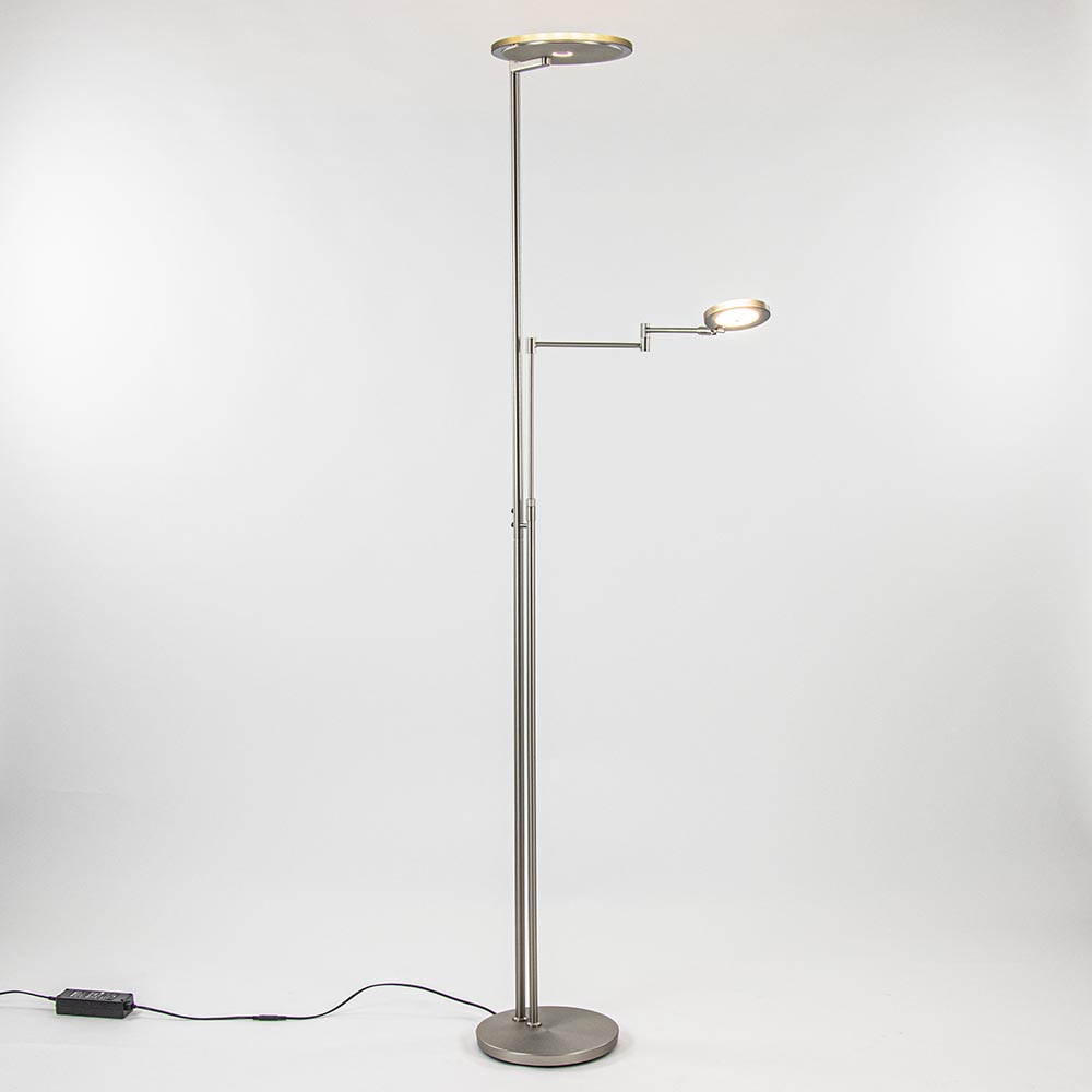 – hoogte: 185 cm – uplighter: Ø25×2 cm – leeslamp: Ø11×2 cm – voet: Ø27×3 cm – inclusief LED – 2700 Kelvin – 4000+1000 lumen – dimbaar – verstelbare leesarm – energiezuinig | A+ – zwart snoer: 235 cm