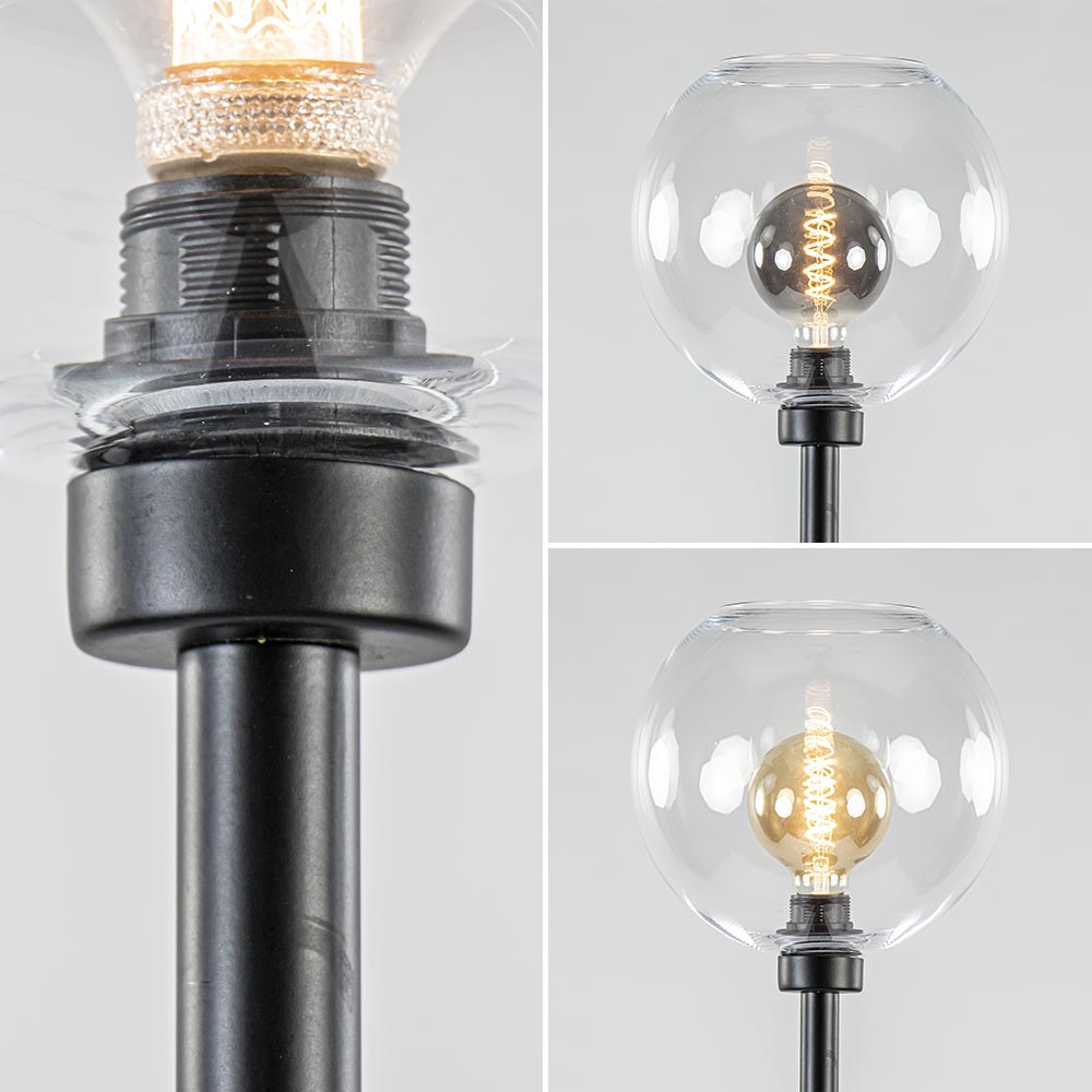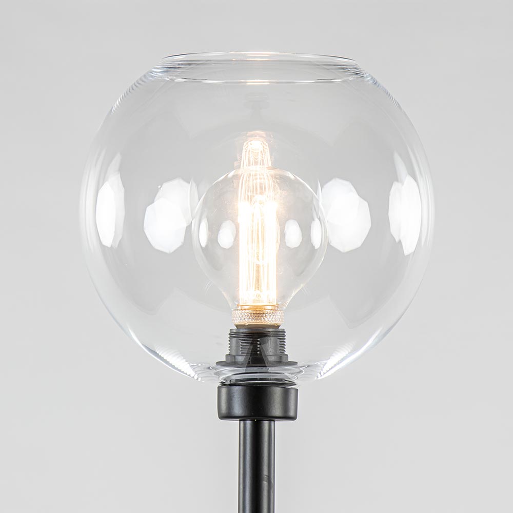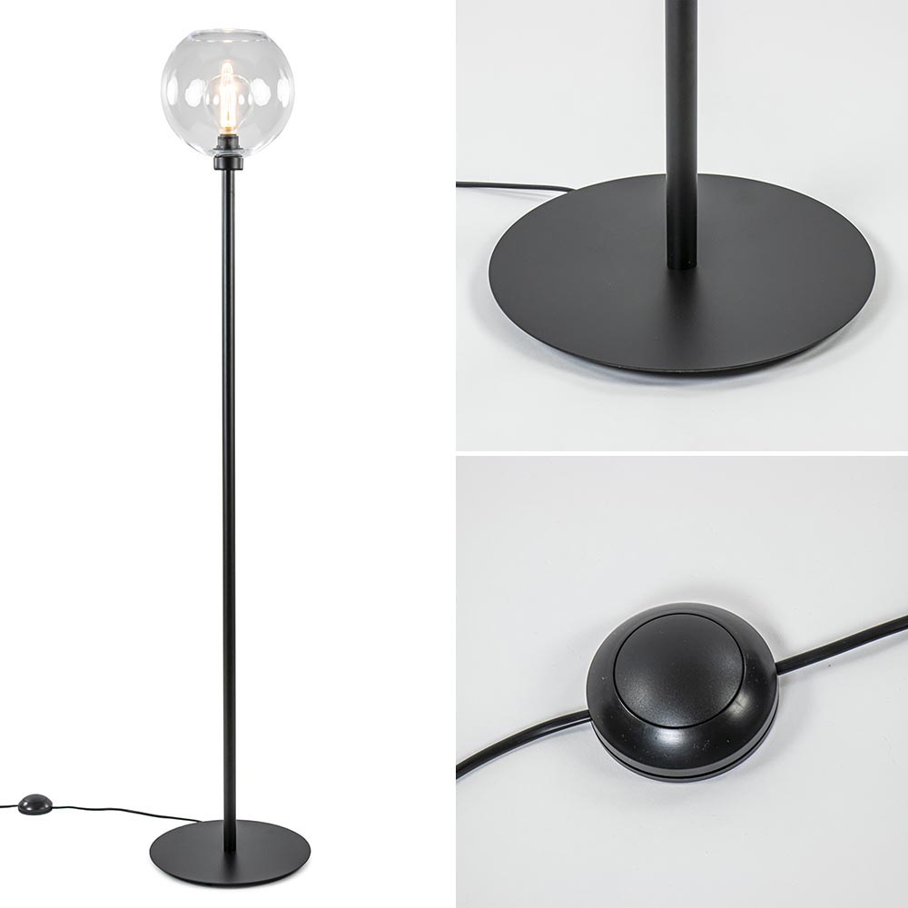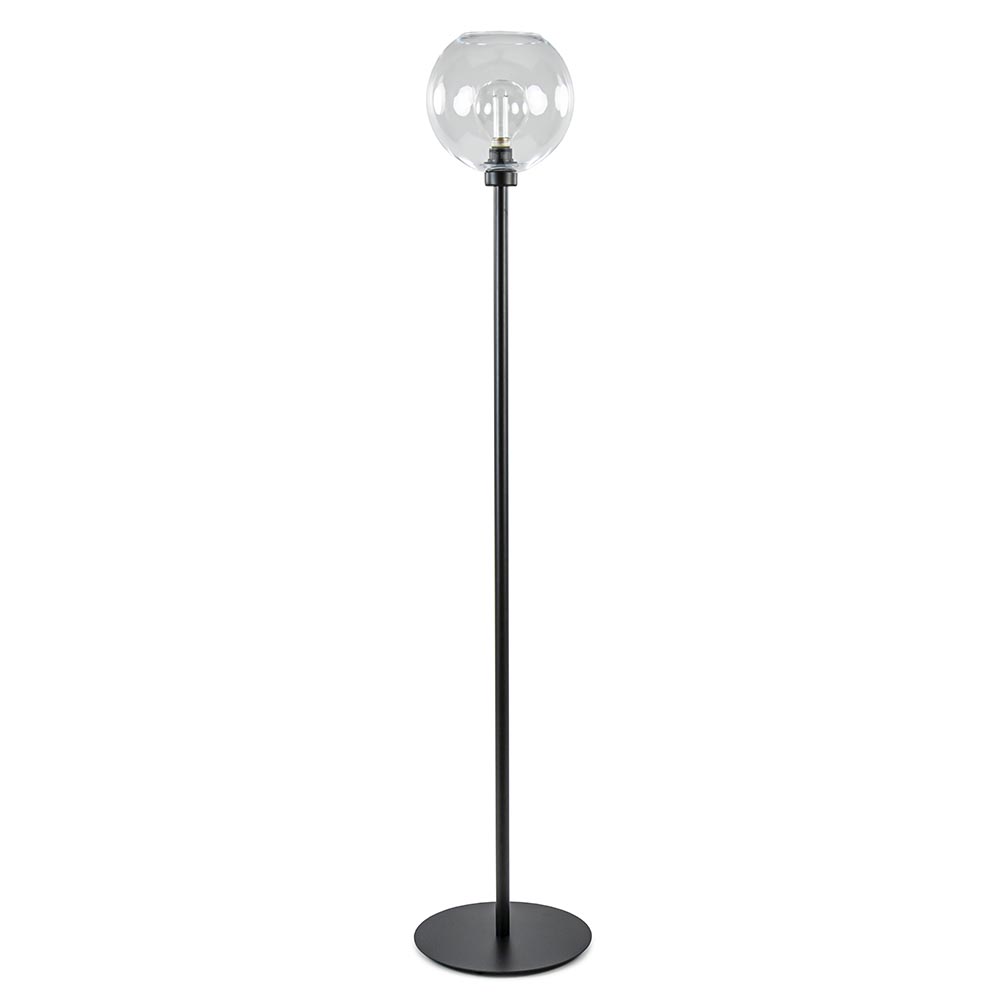 Deze moderne vloerlamp is gecombineerd met een helder glazen kap en past zo in vrijwel ieder interieur. Het heldere glas zorgt er ook voor dat er meerdere soorten lichtbronnen in kunnen waarmee u de lamp een andere uitstraling kunt geven. De helder glazen bol wordt ondersteund door een mat zwart armatuur dat is voorzien van een zwart snoer van 185 cm, met een voetschakelaar op 45 cm van de voet. De moderne vloerlamp wordt geleverd zonder lichtbron (E27).