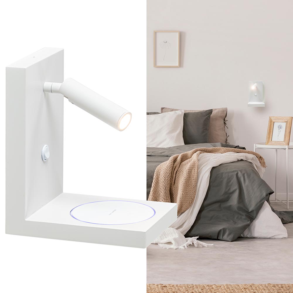 Een perfecte wandlamp voor liefhebbers van de nieuwste smartphones. De rechthoekige wandlamp is namelijk voorzien van een fast charger. Als uw smartphone dus geschikt is voor draadloos opladen dan hoeft u deze alleen maar op het plankje te leggen en de fast charger reageert automatisch, deze zal even blauw oplichten wanneer het opladen begint zodat u ziet dat er contact is. De moderne wandlamp heeft een verstelbare spot welke is voorzien van LED, ideaal wanneer u nog even wilt lezen voor het slapen. De witte wandlamp heeft geen snoer, het is dus van belang dat deze direct op een stroompunt kan worden aangesloten.