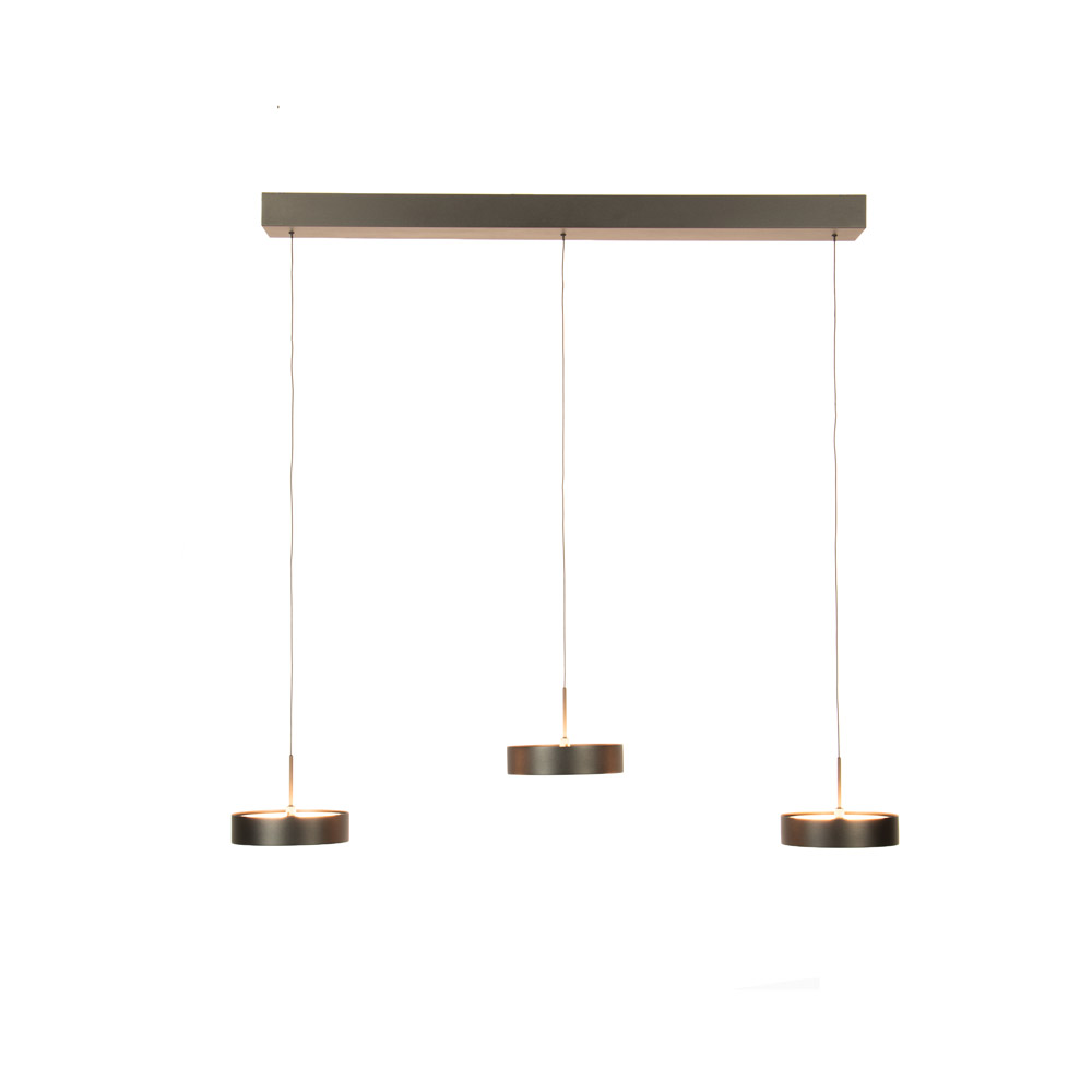 De Alieno 3-lichts hanglamp is de compacte variant binnen deze serie en ideaal voor wie hetzelfde krachtige ontwerp zoekt, maar minder ruimte heeft. De langwerpige plafondbevestiging draagt drie afzonderlijke ronde lichtmodules die speels onder de balk hangen. Elk cirkelvormig lichtpunt geeft licht zowel naar beneden als naar boven, waardoor de lamp zorgt voor functioneel licht op het oppervlak én sfeervol indirect licht richting het plafond.