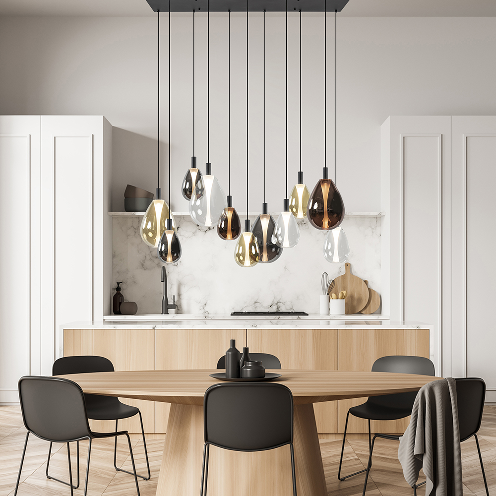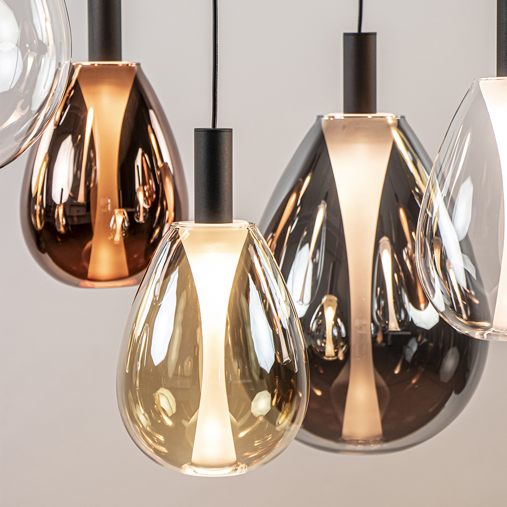 Een echte wauw-factor voor boven de eettafel. Deze luxe 11-lichts hanglamp straalt een en al luxe en elegantie uit. De hanglamp heeft een mat zwart armatuur dat is gecombineerd met diverse glazen kappen in de kleur smoke, amber, rose en helder. Dit geeft de hanglamp echt die hotel chic uitstraling. Dit wordt versterkt door het matte binnenglas dat oplicht wanneer de lamp wordt ingeschakeld. Zo onstaat er een mooi effect in het glas. De grote hanglamp is voorzien van geïntegreerd LED en geeft met 2700 Kelvin een fijne en sfeervolle warm witte verlichting. Dit is dimbaar middels een externe dimmer (exclusief).