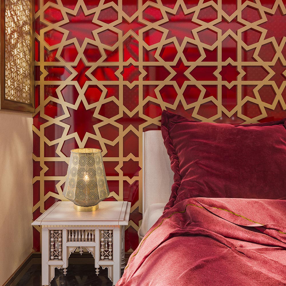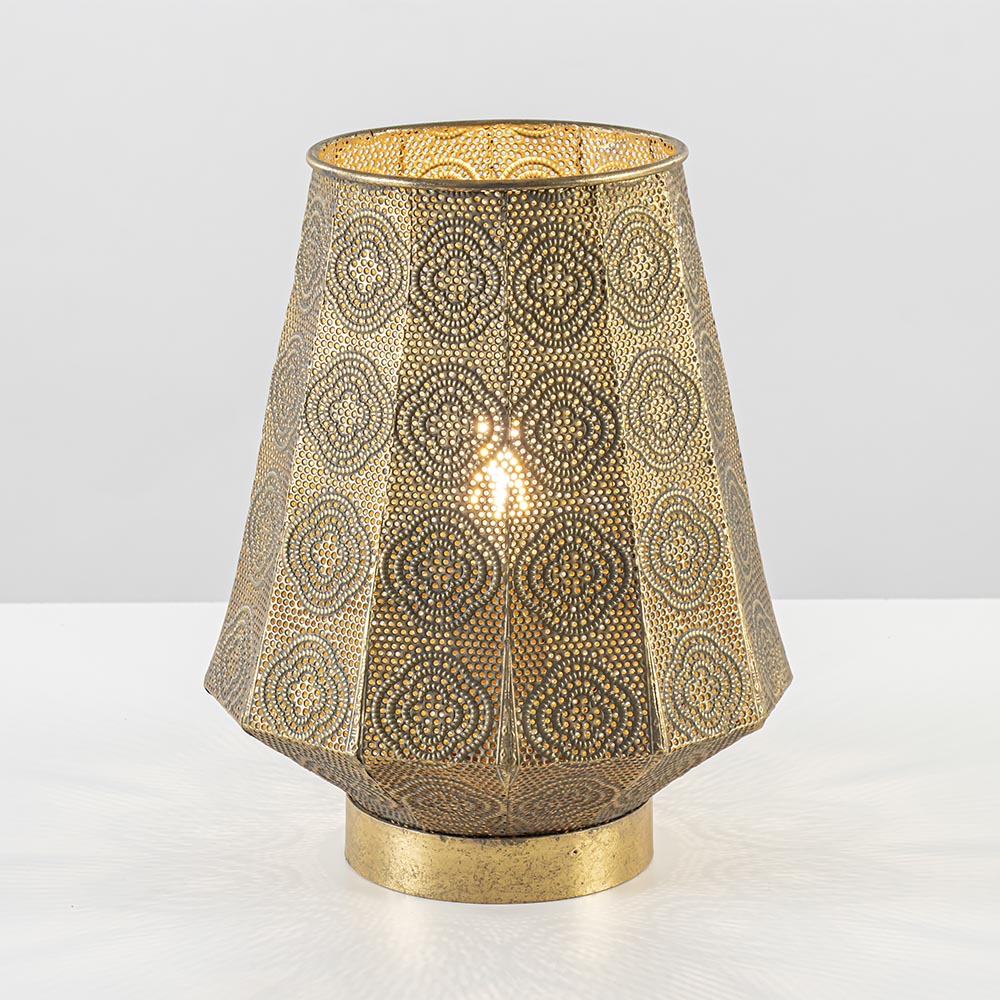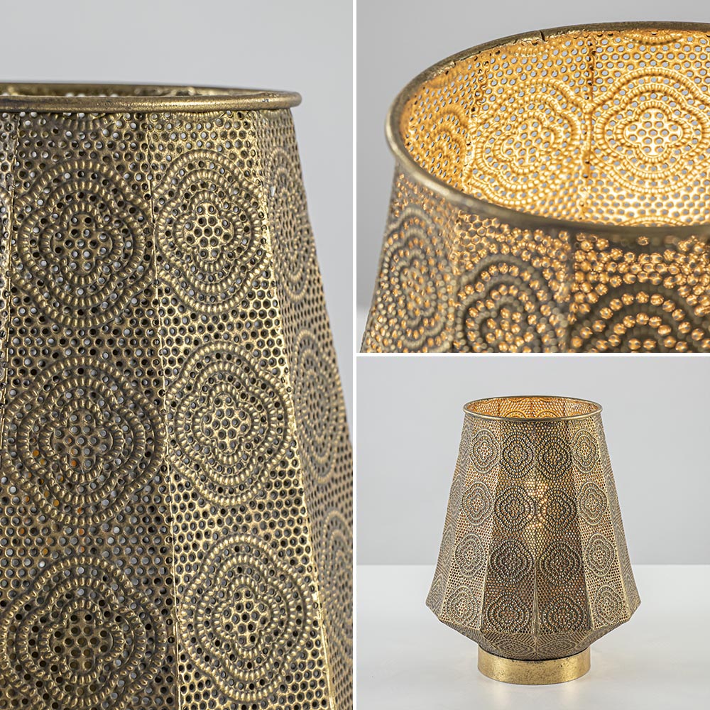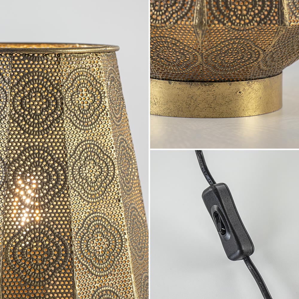 Sfeervol op een dressoir, kast of bijzettafel. Deze lantaarn tafellamp brengt een beetje Oosterse sfeer in huis. De tafellamp is volledig gemaakt van metaal en voorzien van een decoratief dessin welke nog meer opvalt wanneer de lamp wordt ingeschakeld. Het metaal is verder geperforeerd zodat deze voldoende licht kan doorlaten maar er niet direct in de lichtbron kan worden gekeken. De Oosterse tafellamp is uitgevoerd in het goud en heeft een antieke afwerking wat de lantaarn een doorleefde look geeft. De gouden tafellamp met dessin heeft een zwart snoer van 180 cm met een knipschakelaar op 30 cm van de lamp en wordt zonder lichtbron (E27) geleverd.