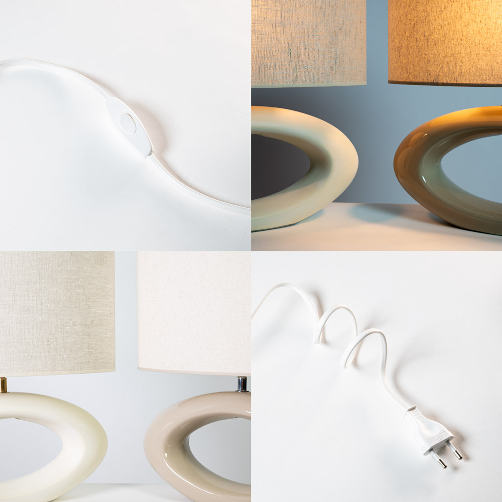 Highlights • Keramische tafellamp met zachte, organische vormen • Keuze uit taupe of mat gebroken wit • Kantelbaar hoofd voor het gericht instellen van het licht • Stoffen kap voor warm en diffuus sfeerlicht • Snoerlengte 160 cm