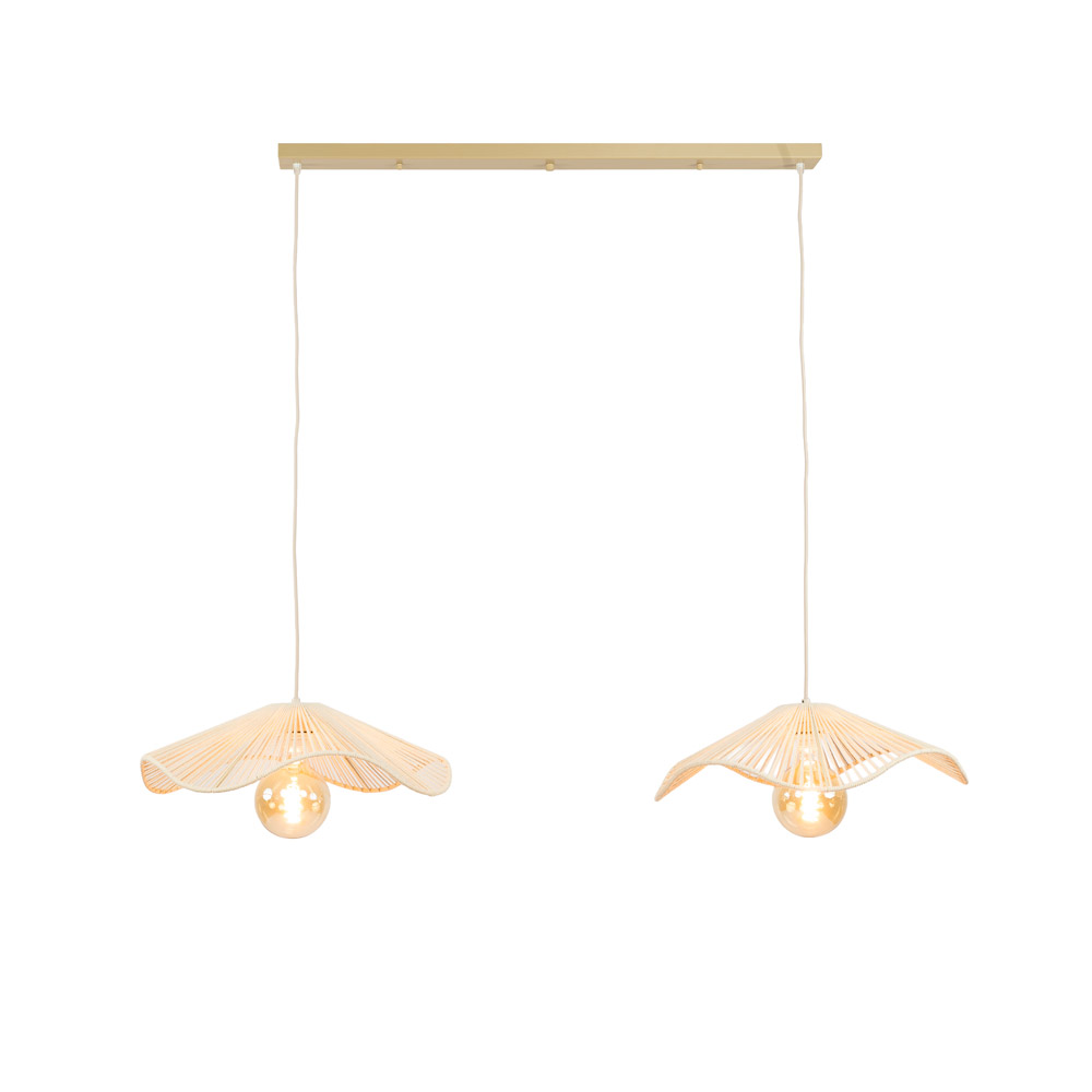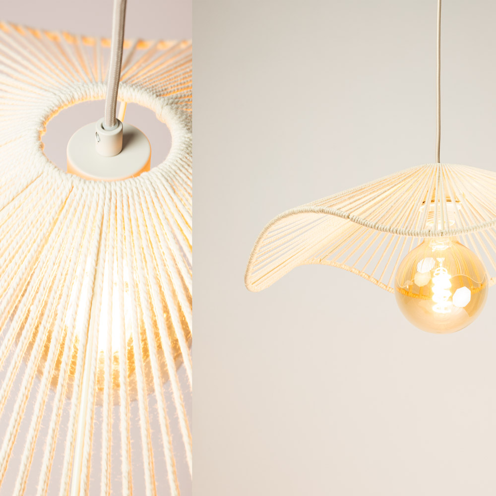 • Organische hanglamp met twee golvende kappen • Metalen frame met touwomwikkeling voor een warme uitstraling • Perfect voor decoratieve filament lichtbronnen • Ideaal boven een eettafel of kookeiland • Dimbaar met geschikte lichtbron en wandschakelaar