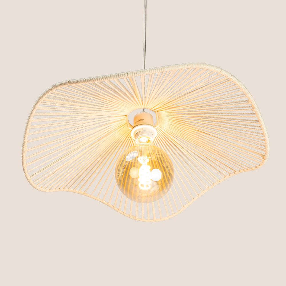 De Rafa hanglamp is een echte blikvanger boven de eettafel of het kookeiland. De twee grote kappen hebben een speelse, golvende vorm en bestaan uit een metalen frame dat volledig is omwikkeld met touw. Dit zorgt voor een natuurlijke, warme uitstraling die perfect past in moderne, Scandinavische en Japandi interieurs.