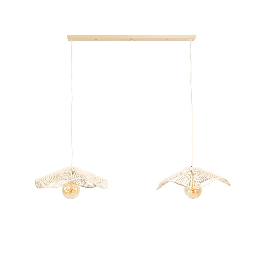 • Producttype: Hanglamp • Kleur: Beige / zand • Materiaal: Metaal en touw • Lichtpunten: 2 • Fitting: E27 • Max. wattage: 60W per lichtpunt • Lichtbron: Niet inbegrepen • Dimbaar: Ja, via externe schakelaar en geschikte lichtbron (niet inbegrepen) • Afmetingen totale lamp: H 130 × L 140 × B 58 cm • Afmetingen bevestiging: H 2,5 × L 90 × B 8 cm • Afmetingen kap: Ø 50 cm