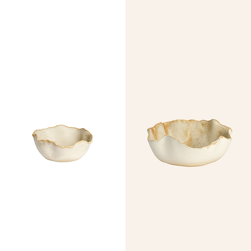 • Afmetingen S: Ø 26 x H 10,5 cm • Afmetingen M: Ø 36,5 x H 14 cm • Materiaal: Keramiek • Kleur: Naturel / crème met warme kleurnuances