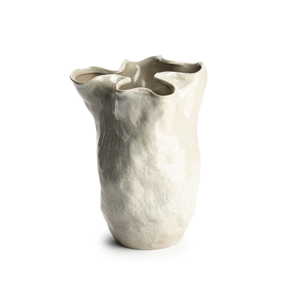 Een bijzondere keramieken vaas met een organische, golvende vorm en een zachte wit gemêleerde afwerking. De Reguengos vaas is prachtig als los decoratief object, maar komt ook extra mooi tot zijn recht wanneer je meerdere maten samen combineert voor een speels en stijlvol geheel.