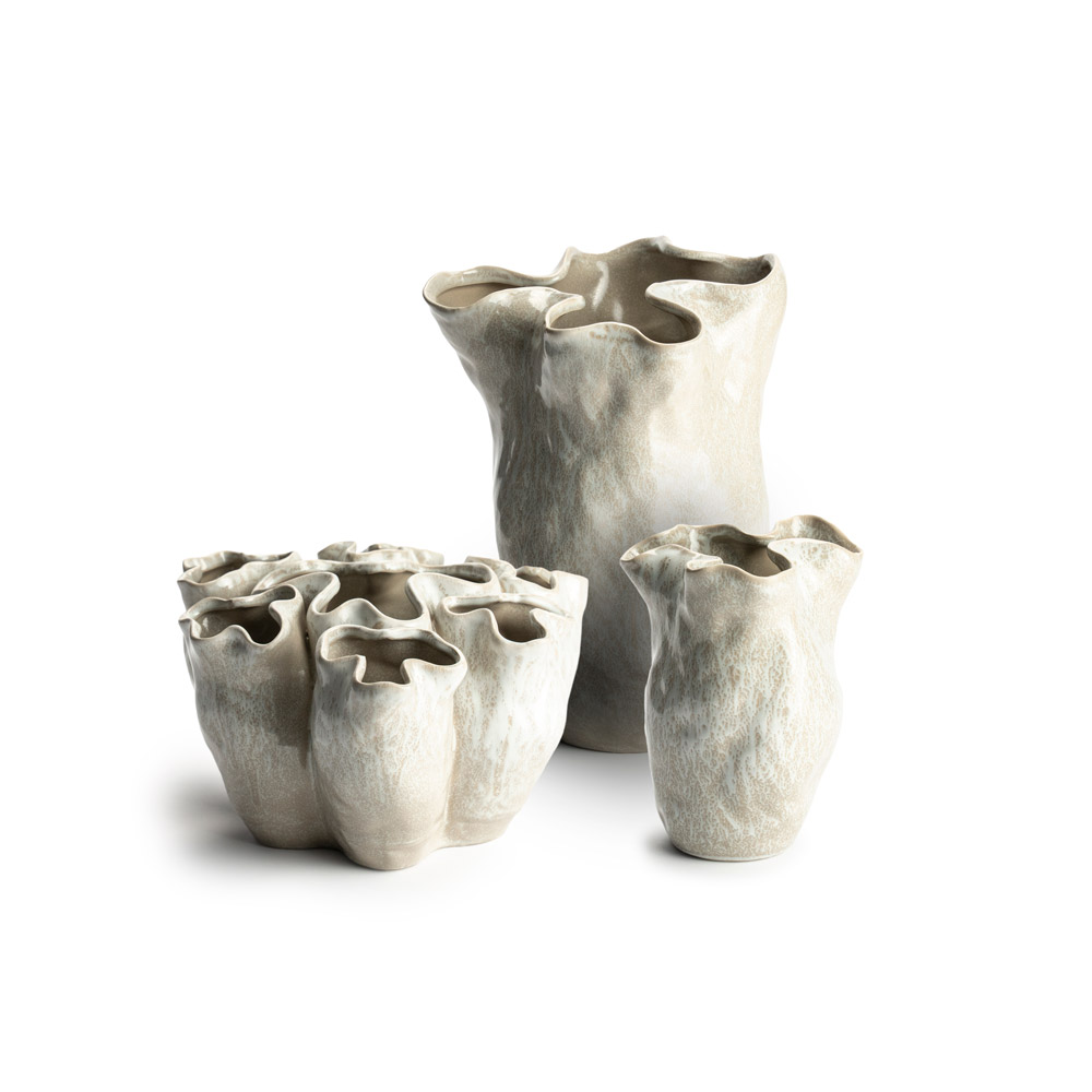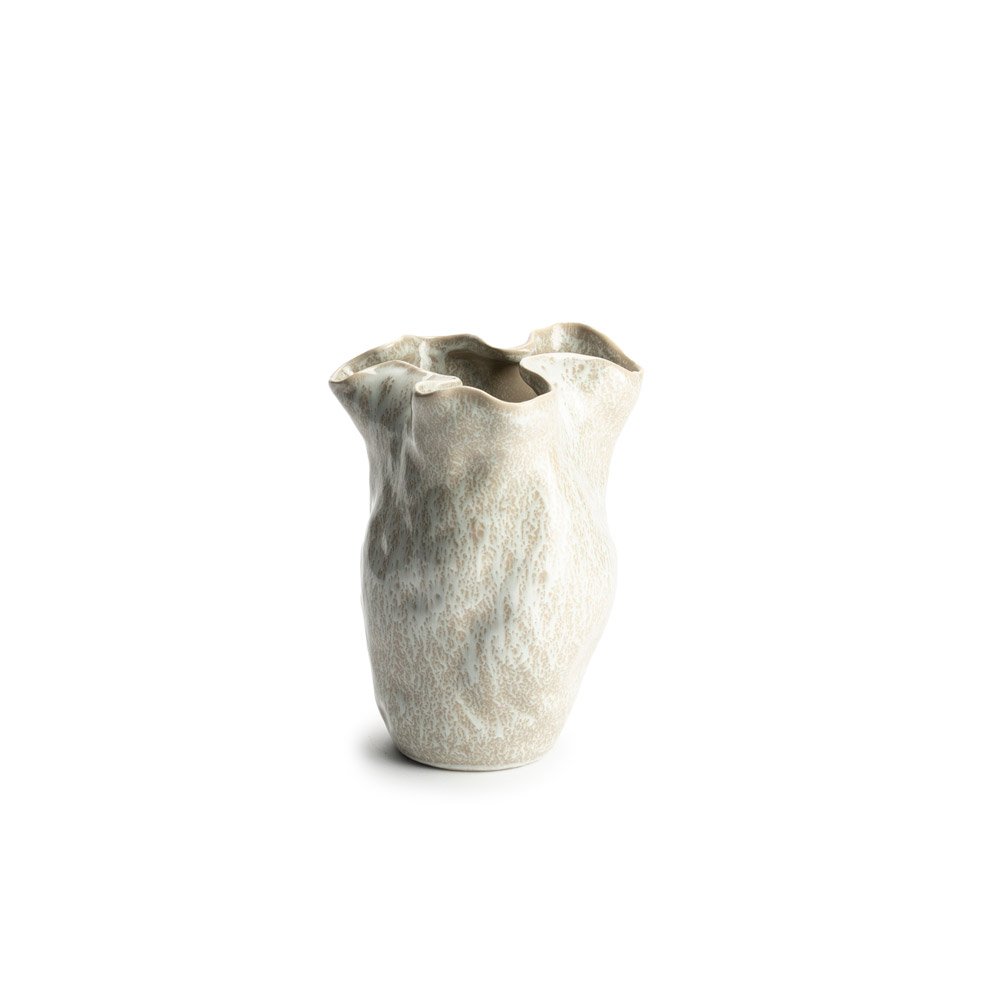 Een bijzondere keramieken vaas met een organische, golvende vorm en een zachte wit gemêleerde afwerking. De Reguengos vaas is prachtig als los decoratief object, maar komt ook extra mooi tot zijn recht wanneer je meerdere maten samen combineert voor een speels en stijlvol geheel.