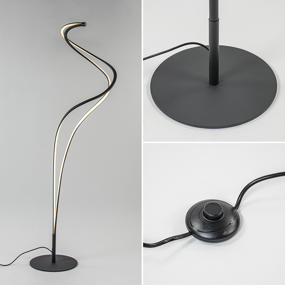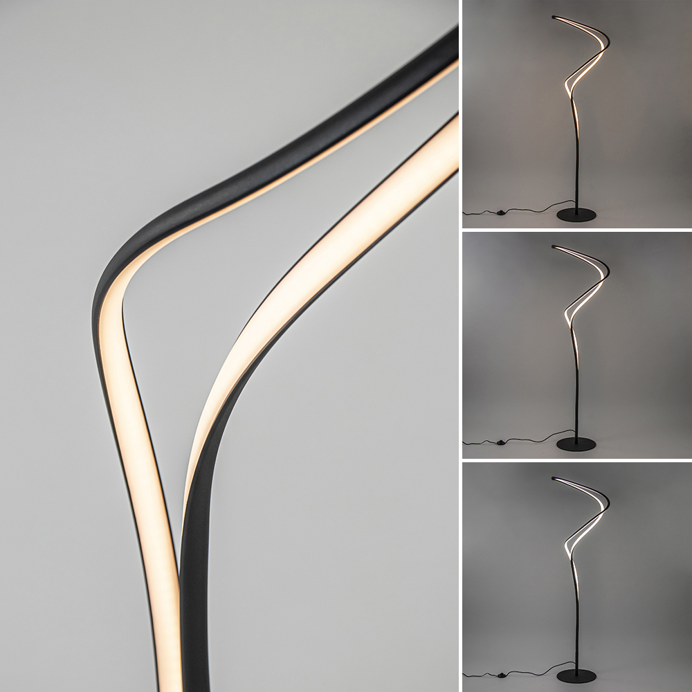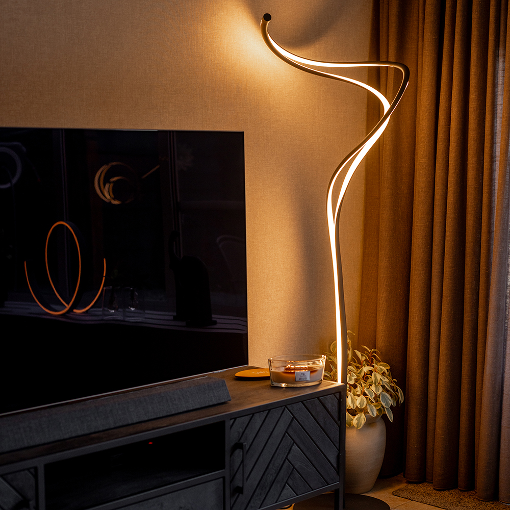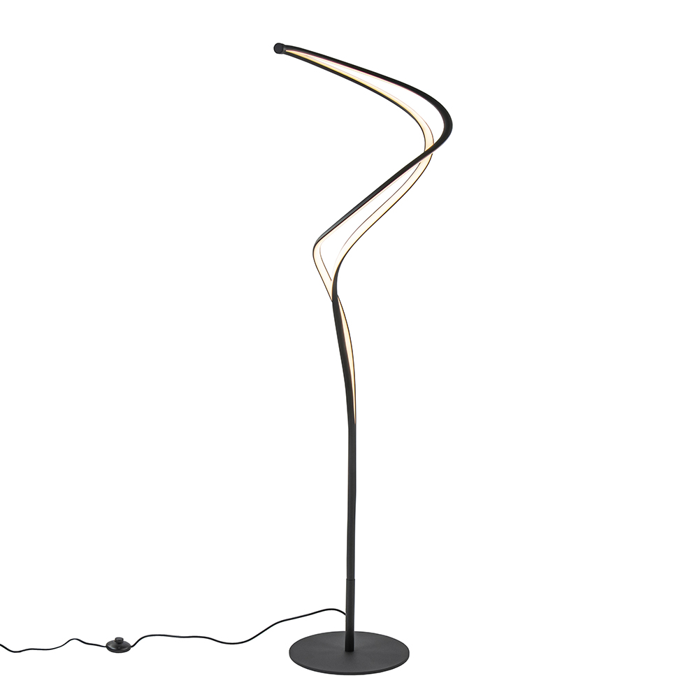 Strak van design en organisch van vorm. Deze moderne vloerlamp past helemaal in de huidige woontrends. De vloerlamp heeft een zwart armatuur en is over de sierlijke armen volledig voorzien van geïntegreerd LED. Deze geeft met 5500 lumen een fijne lichtopbrengst. Is deze te veel? Dan dimt u de lamp gemakkelijk dmv de dimmer in het snoer ingedrukt te houden. Ook kunt u de kleurtemperatuur veranderen door een druk op de dimmer. Deze varieert van 2300 en 3000, tot 4000 Kelvin. In iedere kleurtemperatuur kunt u de lamp dimmen. Creëer dus gemakkelijk en snel de sfeer die past bij het moment. De moderne LED vloerlamp is voorzien van een zwart snoer met een lengte van 210 cm. De dimmer zit op 65 cm van voet.