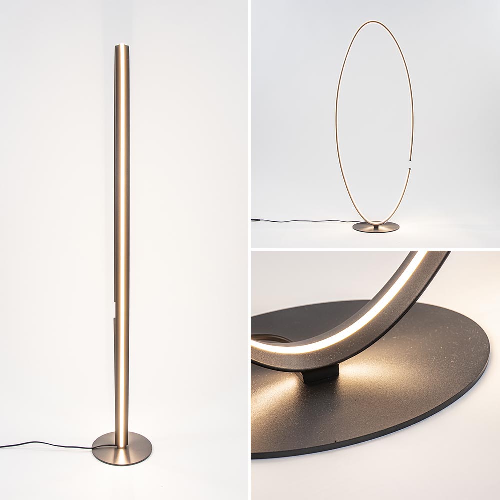 Een strak vormgegeven vloerlamp met energiezuinige LED verlichting. De moderne vloerlamp heeft een ovale armatuur die zowel aan de binnen- als buitenzijde is voorzien van een LED strip. De LED verlichting geeft met 2700 Kelvin een sfeervolle warm witte verlichting die dmv die dimmer in het snoer ook naar wens is te dimmen. Zo creëert u gemakkelijk de gewenste sfeer. Het armatuur heeft een open constructie dat wordt versterkt door de opening. Dit geeft de zwarte LED vloerlamp nog meer een design look. De staande LED lamp is voorzien van een zwart snoer van 255 cm met een dimmer op 90 cm van de lamp.